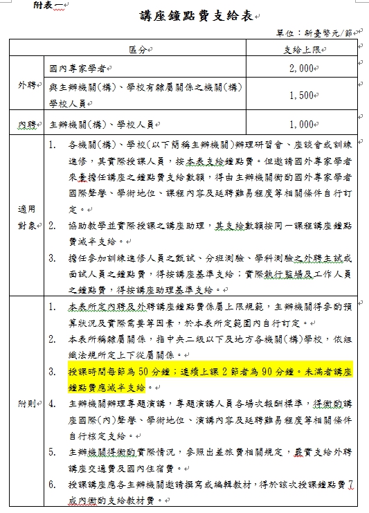 (一)講座鐘點費:邀請講座授課或演講報酬之支給,依行政院訂頒「講座鐘點費支給表」辦理,標準如附表一。