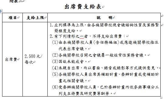 (二)出席費:邀請專家學者參加具有政策性或專案性之重大諮詢事項會議,出席費之支給,依行政院訂頒「中央政府各機關學校出席費及稿費支給要點」辦理,標準如附表二。