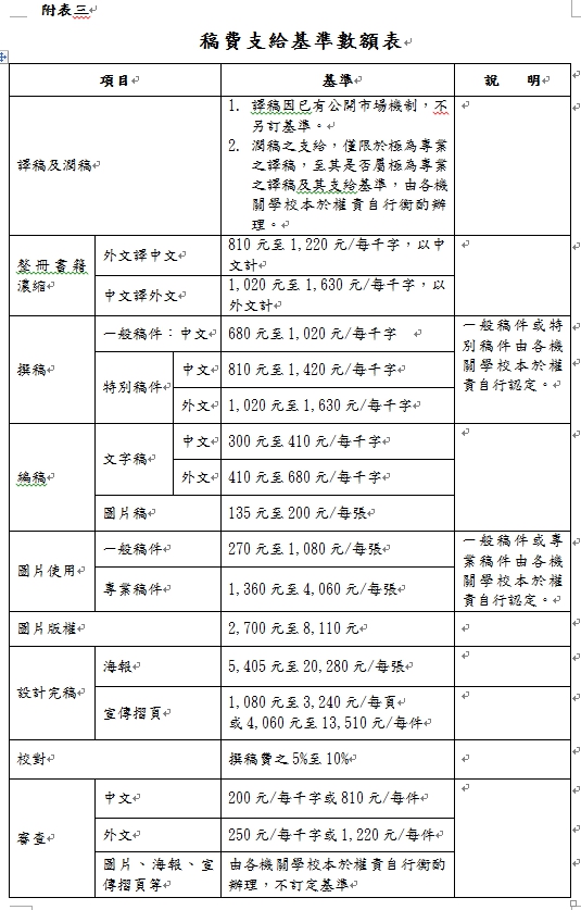 (三)稿費:委(邀)請專人或機構,進行撰稿、譯稿、編稿及審查等工作,稿費之支給,依行政院訂頒「中央政府各機關學校出席費及稿費支給要點」辦理,標準如附表三。
