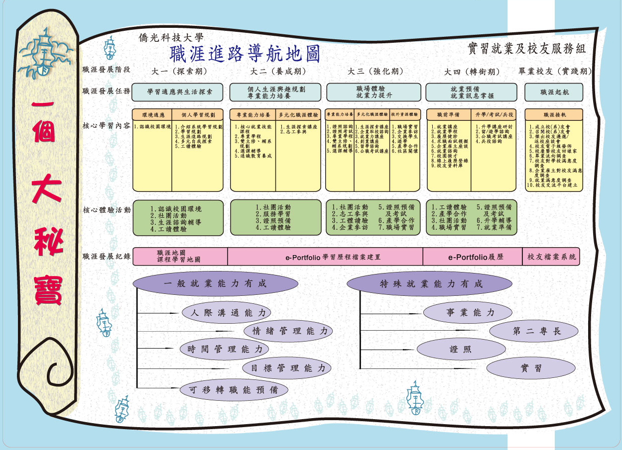 (1) 職涯探索與職涯諮詢:利用教育部UCAN就業職能平台測驗與CPAS就業競爭力量表,進行職能興趣探索和職能診斷,可讓學生提前瞭解職業興趣傾向及職場所需職能,配合大一必修生涯與職能發展通識課程及各系課程學習地圖,進而擬定學習計畫,使學生在校期間就能有目標、有方向的進行職業能力養成。