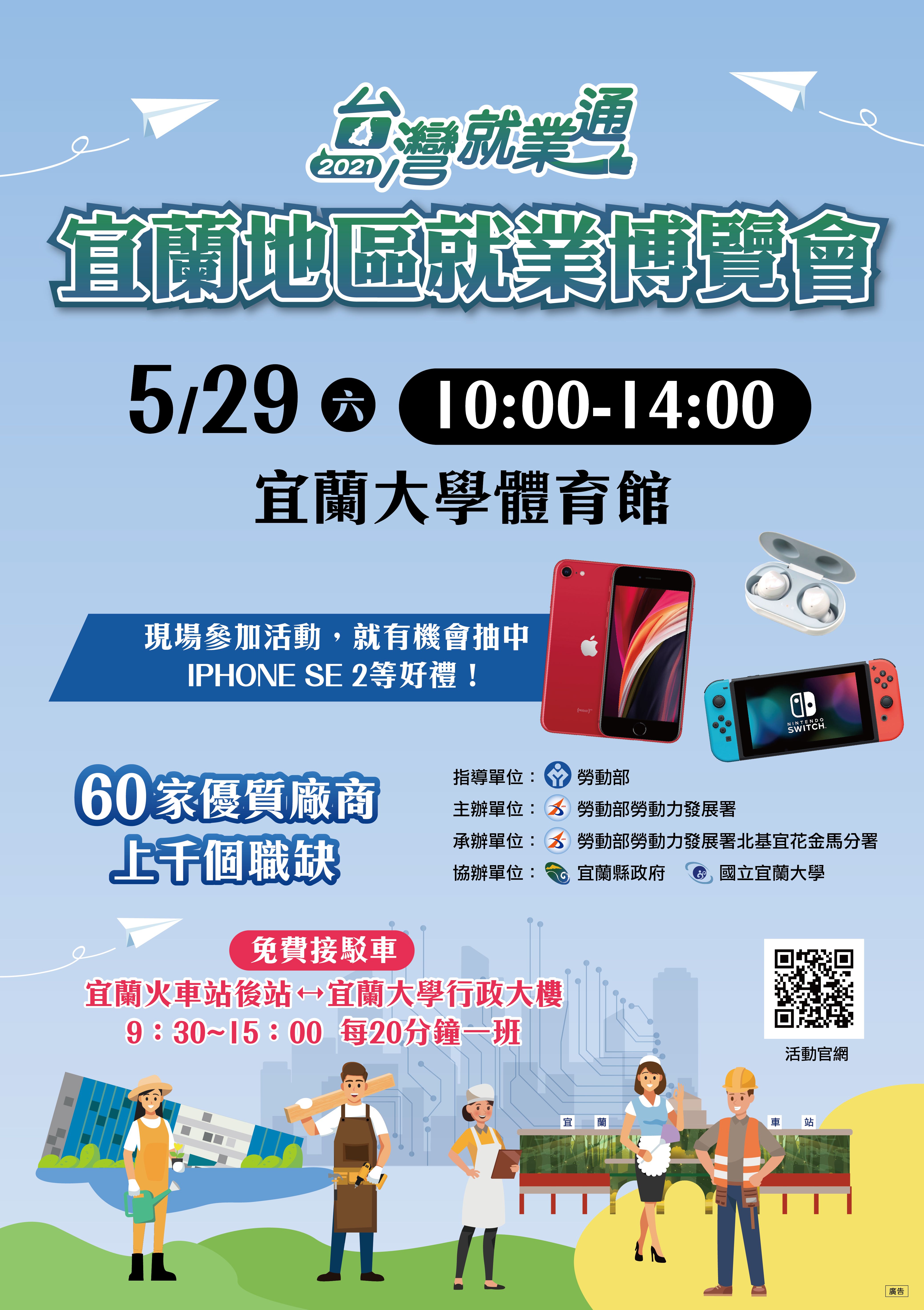 檢送「2021台灣就業通 宜蘭地區就業博覽會」宣傳海報1份,惠請協助宣傳,請查照。