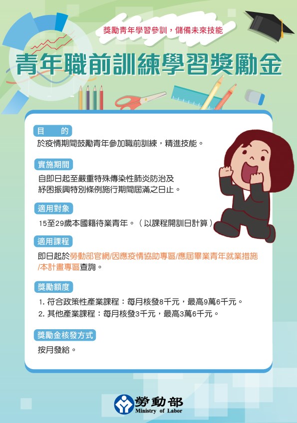 A、產業新尖兵及青年訓練含學習獎勵金(網頁連結):參加職前訓練費用及待業青年學習獎勵金補助。