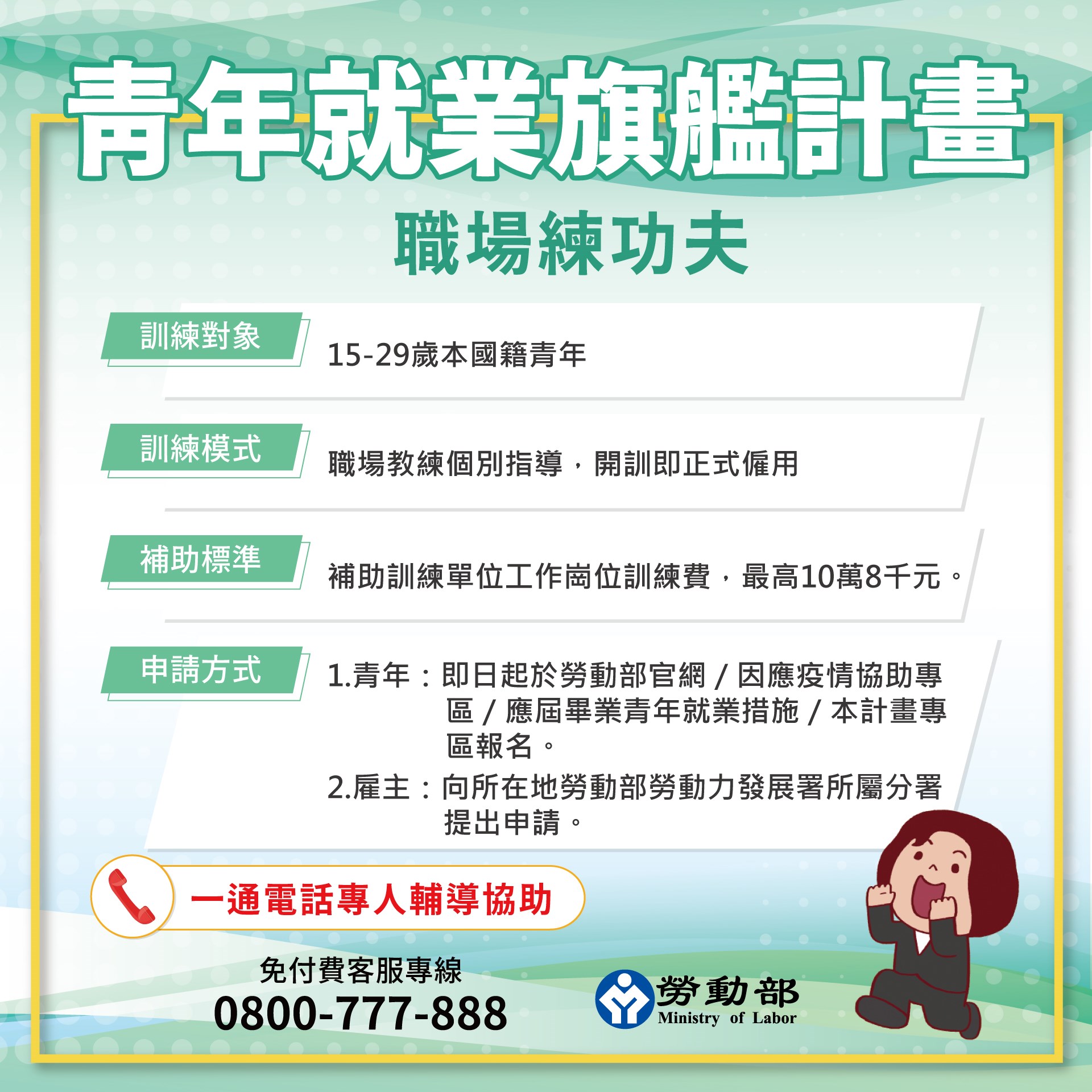 B、青年就業旗鑑計畫(網頁連結):訓練課程及工作崗位訓練補助。