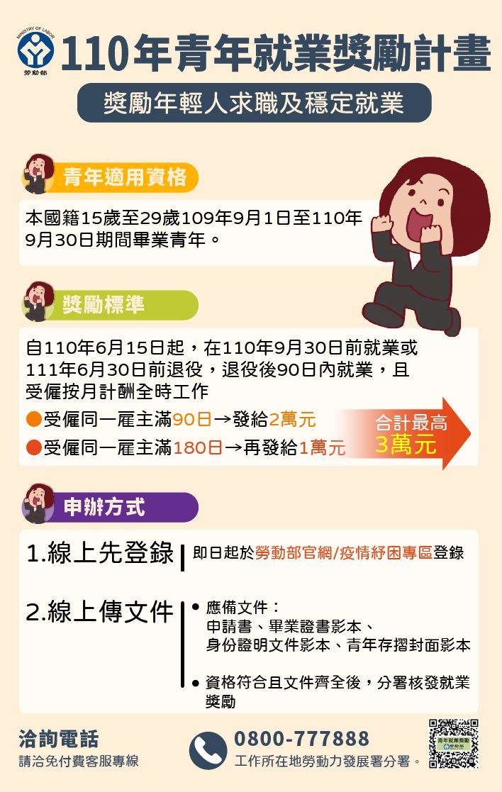對象:本計畫適用對象為本國籍年滿 15 歲至 29 歲,且於 109 年 9 月 1 日至 110 年 9 月 30 日期間畢業(以青年所持畢業證書開立日期認定)青年,29 歲的認定標準,係指 110 年 6 月 15 日當日,青年未滿 30 歲者。