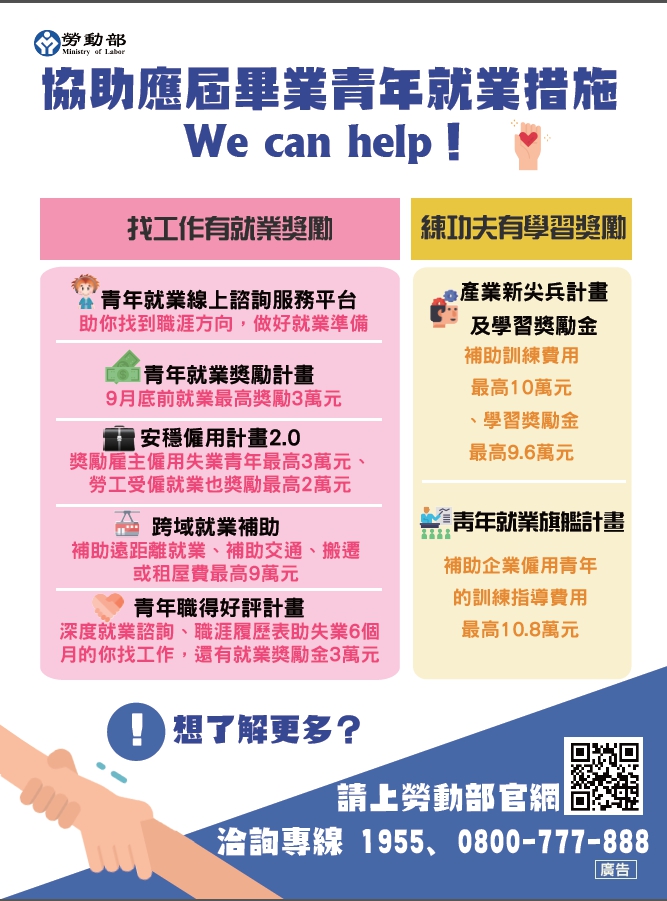 為協助本(110)年應屆畢業青年投入職場,勞動部勞動力發展署彙整「找工作有就業獎勵」及「練功夫有學習獎勵」等相關措施,製作「協助應屆畢業青年就業措施」EDM(如附件),請惠予協助宣傳並轉知應屆畢業校友,以供青年依需求選擇運用。