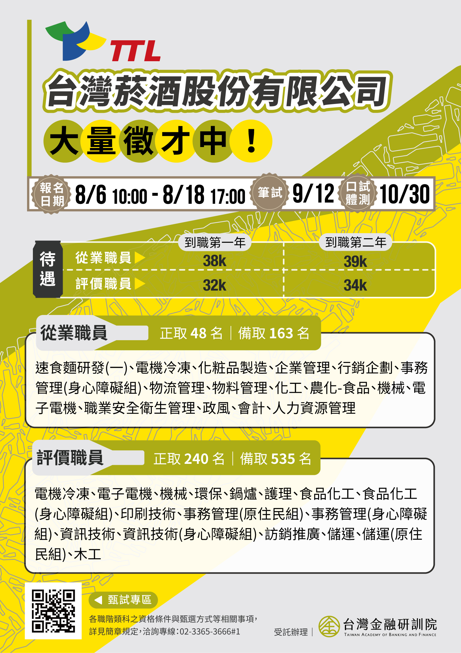 「臺灣菸酒股份有限公司110年從業職員及從業評價職位人員甄試」,預計正取288名、備取698名: