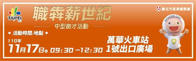 「職犇薪世紀」現場徵才11/17(三)9時30分至12時30分在萬華火車站1號出口廣場直接面試,提供560個優質工作機會,詳細職缺內容請上台北就業大補帖網站,歡迎求職朋友們踴躍參與!