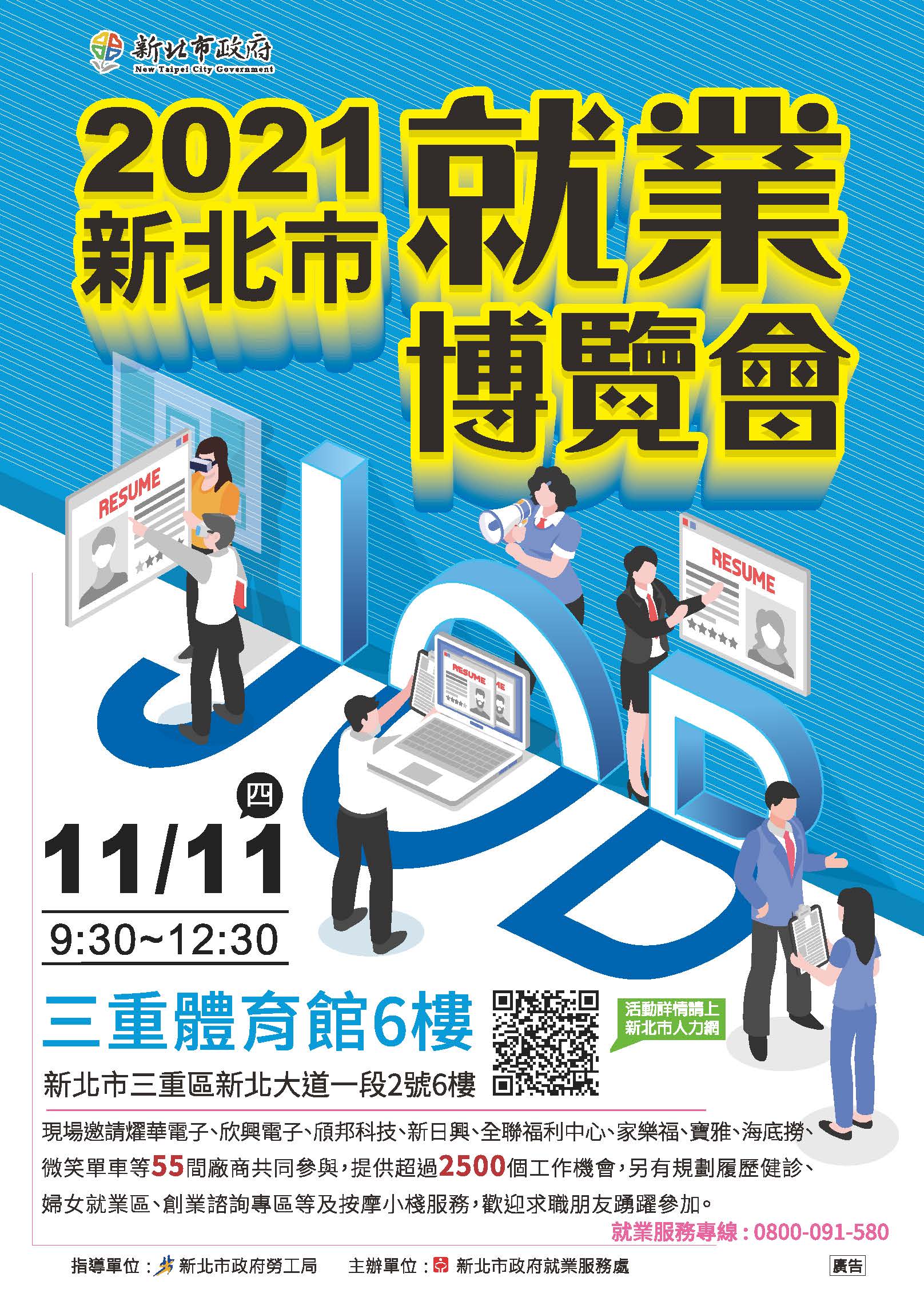 新北市政府就業服務處於11月11日(四)9點30分到12點30分在三重體育館6樓(新北市三重區新北大道一段2號6樓),舉辦「2021新北市就業博覽會」,現場邀請55家知名廠商,提供超過2500個工作機會,歡迎求職者踴躍參加。