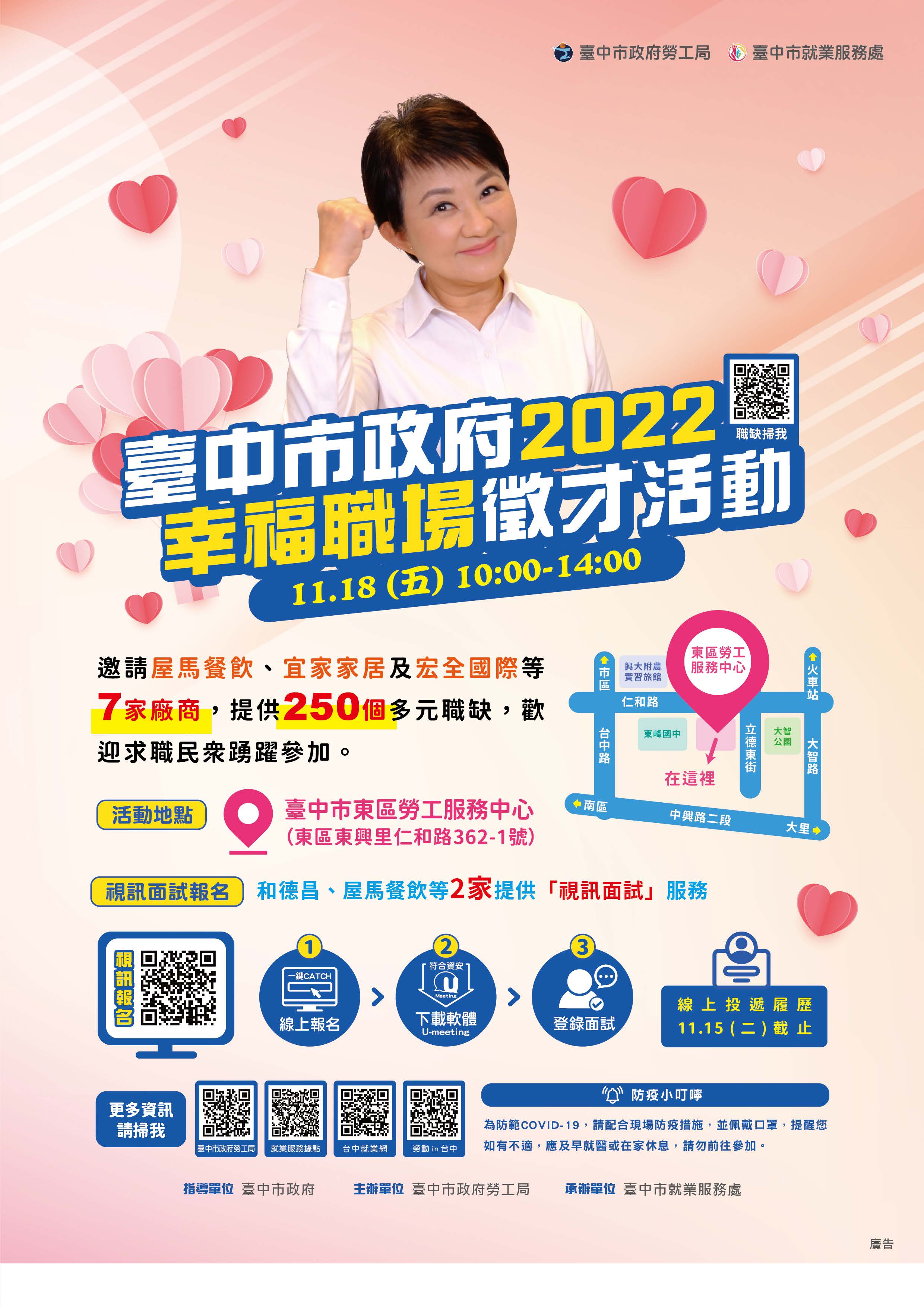 (一)官方網站、臉書、LINE宣傳文稿:「臺中市政府11月18日在東區勞工服務中心辦理幸福職場徵才,邀請7家獲獎幸福企業提供250 個職缺, 詳情請至臺中市就業服務處官網查詢 ,查詢更多職缺資訊:https://www.eso.taichung.gov.tw/2915387/post,請洽04-22289111轉36100洽詢。」。 |