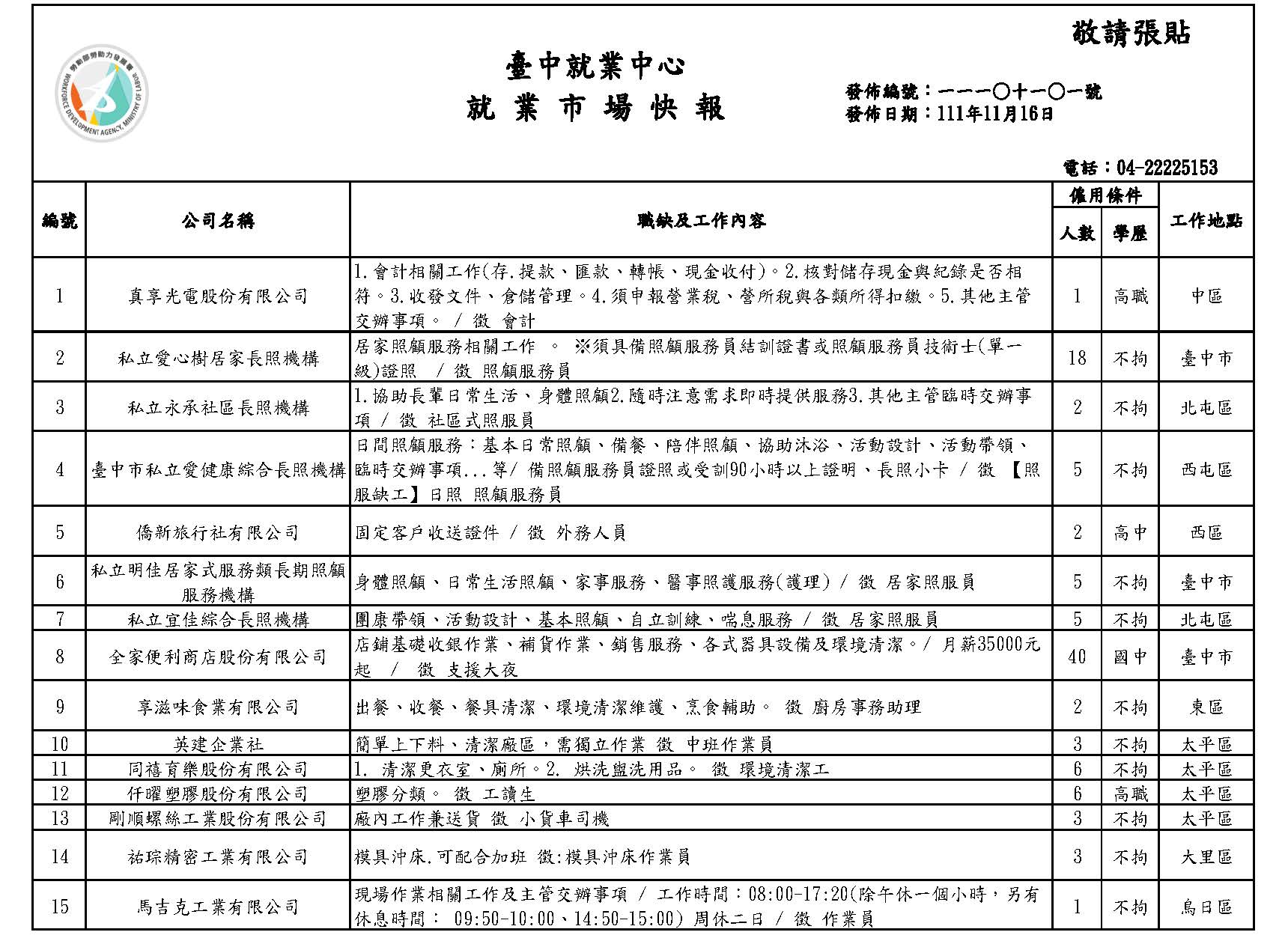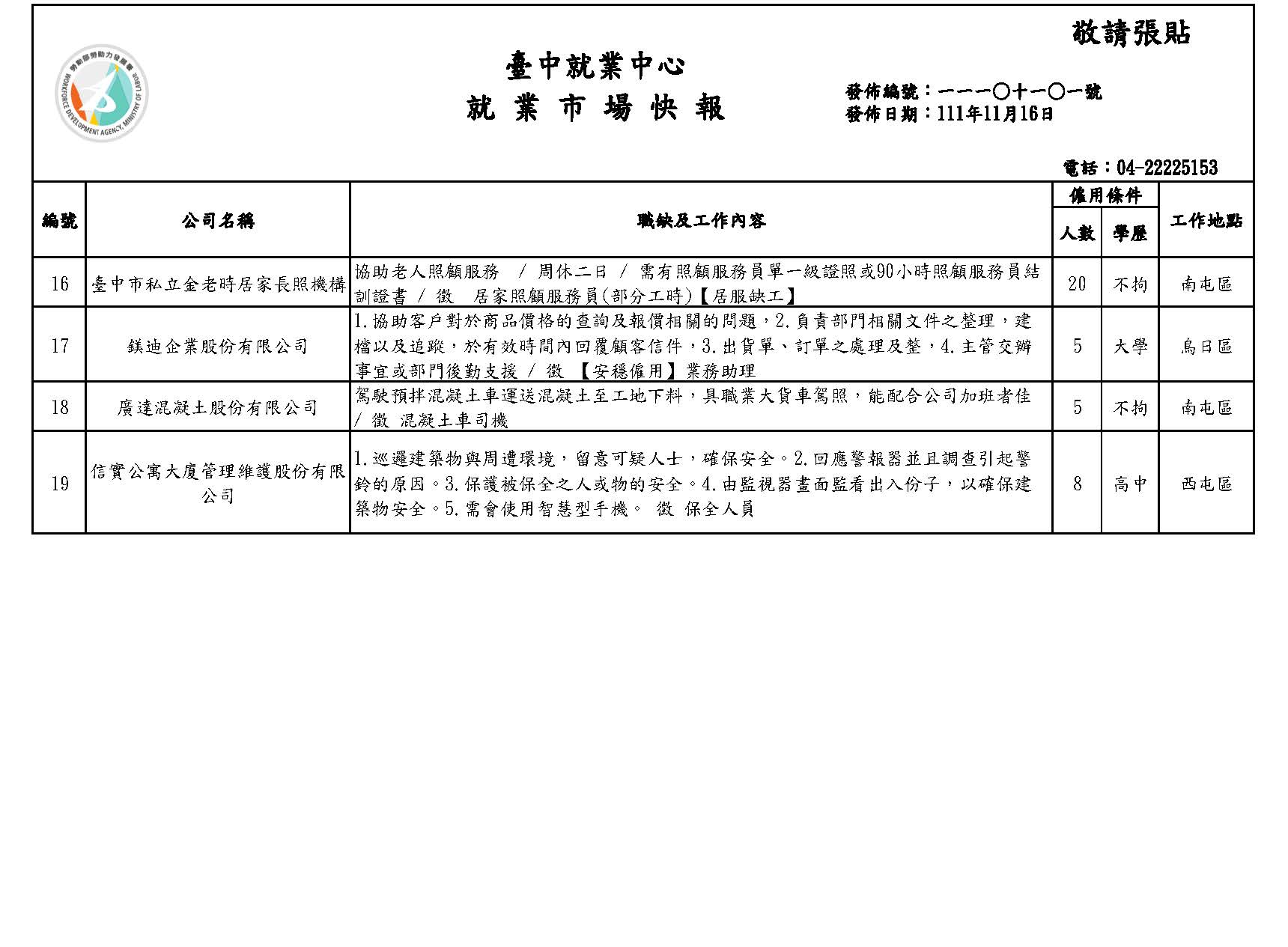 標題:【轉知】臺中就業中心11月份上半月就業市場快報