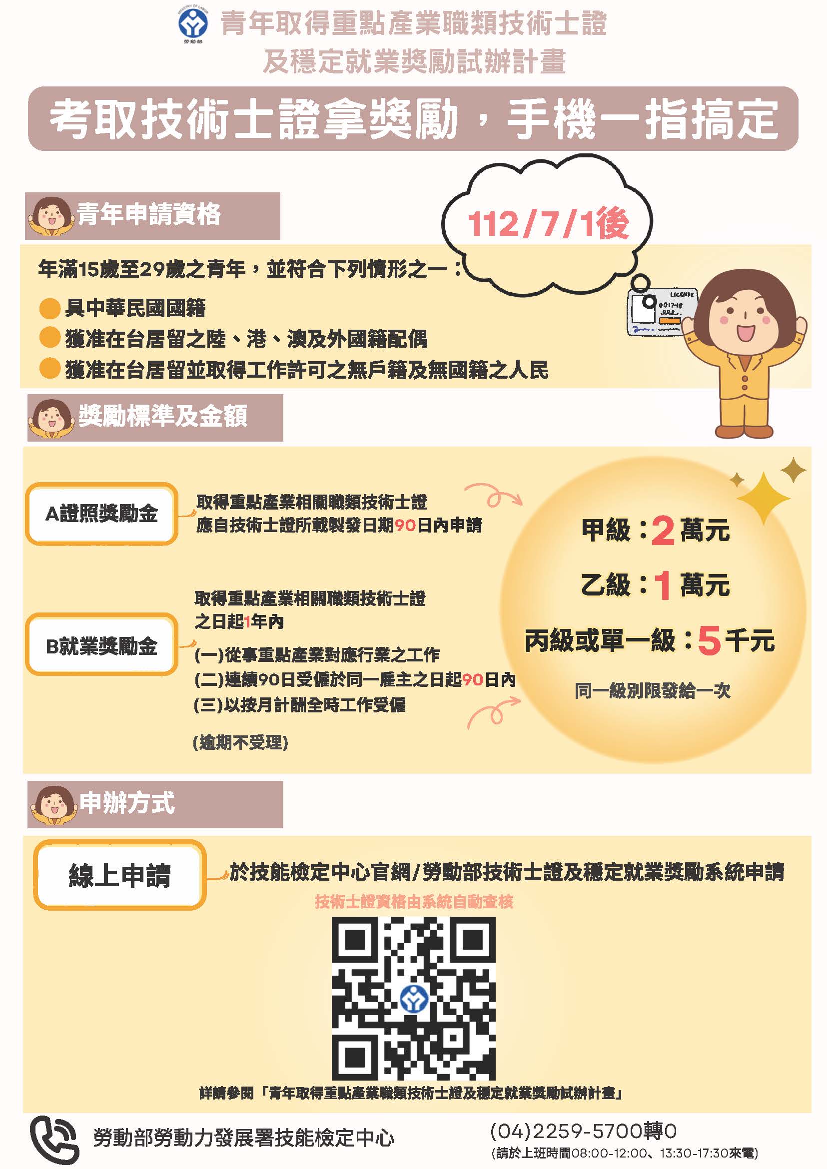 勞動部「青年取得重點產業職類技術士證及穩定就業獎勵試辦計畫(下稱本試辦計畫)」,使更多青年投入專業產業領域,請貴單位協助廣為宣傳 |