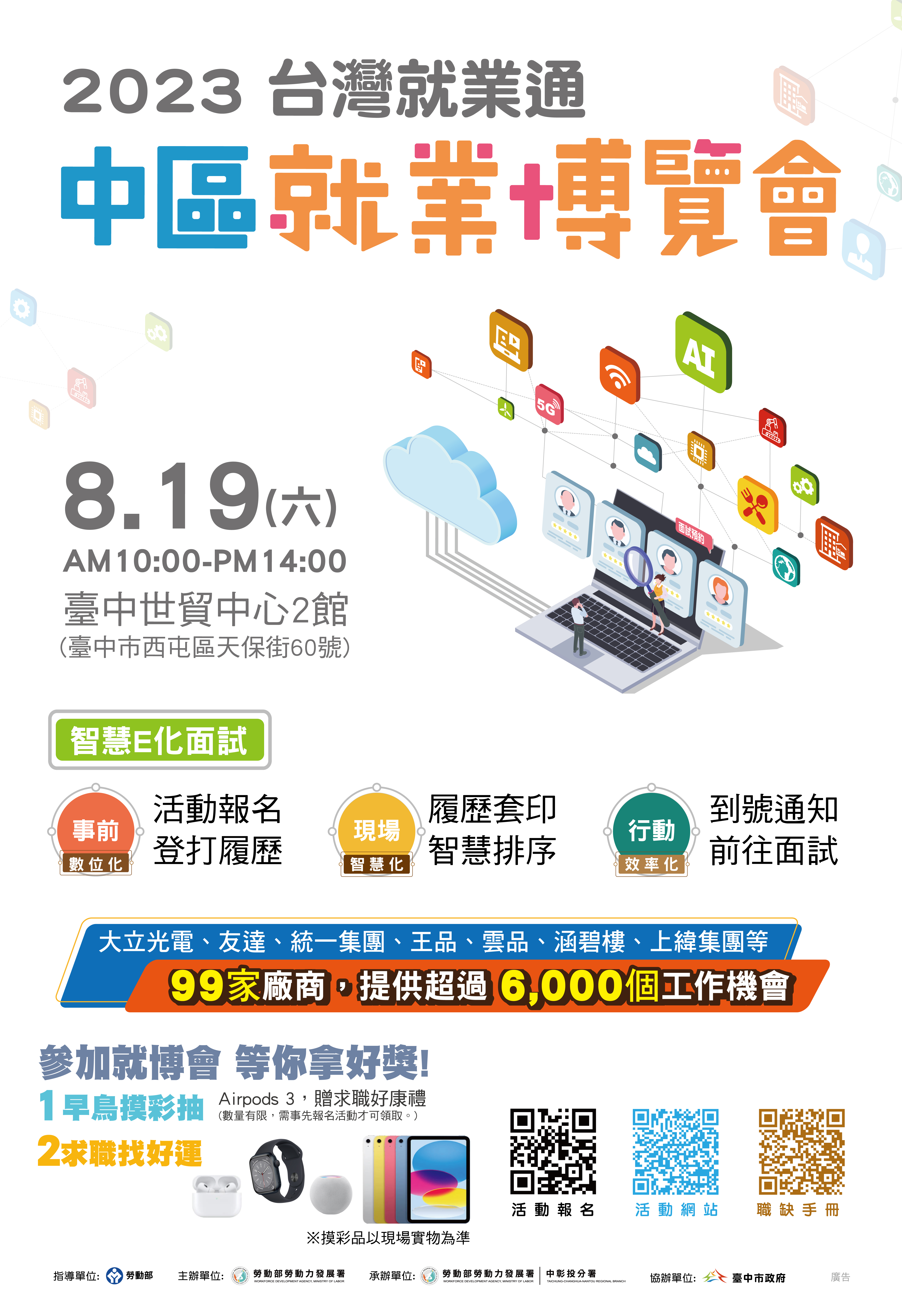 中區就業博覽會在112年8月19日(星期六)10點至2點,於台中世貿中心二館舉辦!近百家廠商提供超過6000個工作機會,事先完成報名更有早鳥好禮及抽獎,豐富好禮等您帶回家!現場有豐富的職業訓練、就業補助、創業、銀髮友善就業等資源,讓您一手掌握!活動報名可查詢台灣就業通網站
