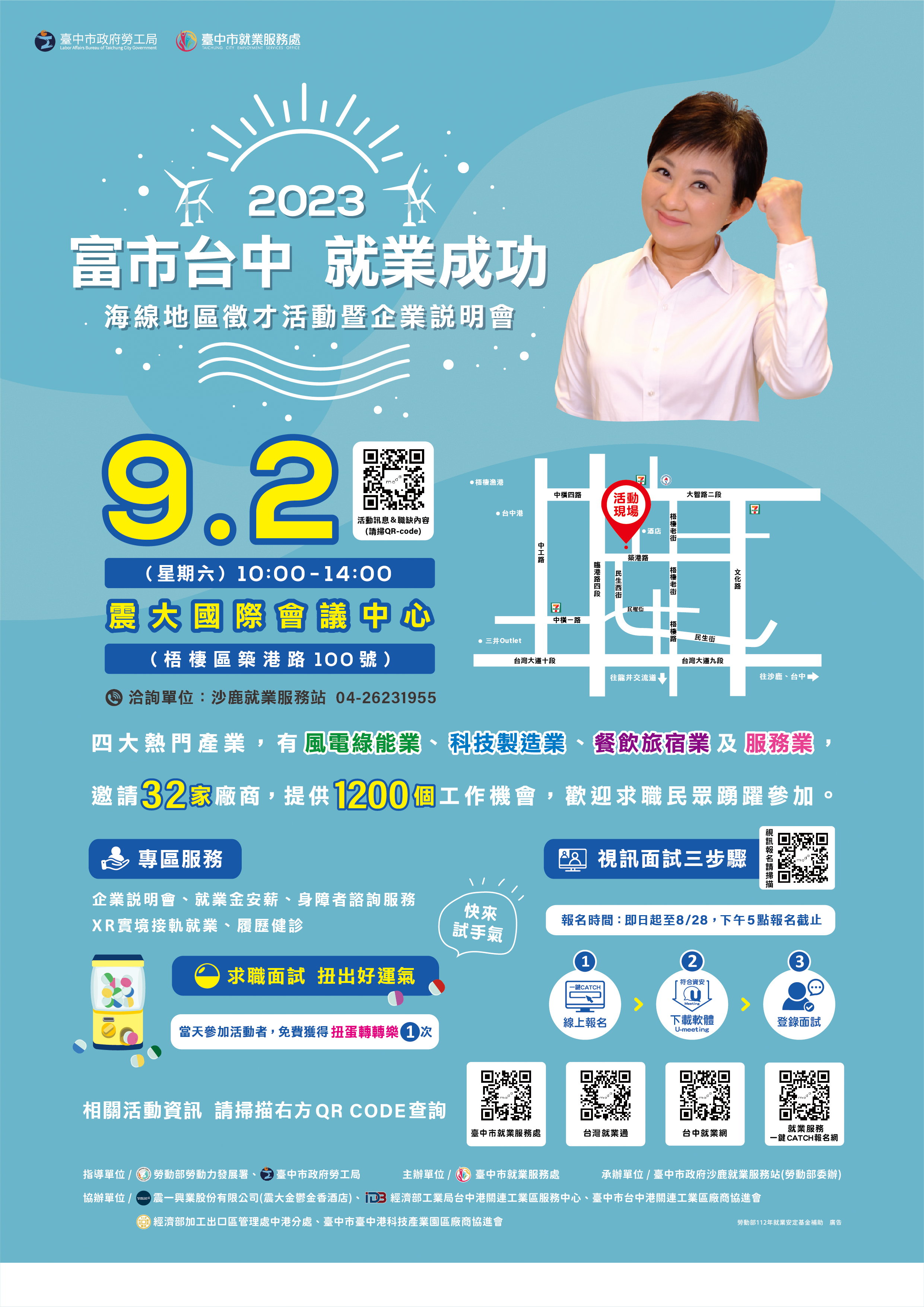 本處訂於112年8月11日(星期五)假經濟部加工出口區管理處臺中分處舉辦「富市台中 就業成功」潭子科技產業園區徵才活動暨就業促進講座。