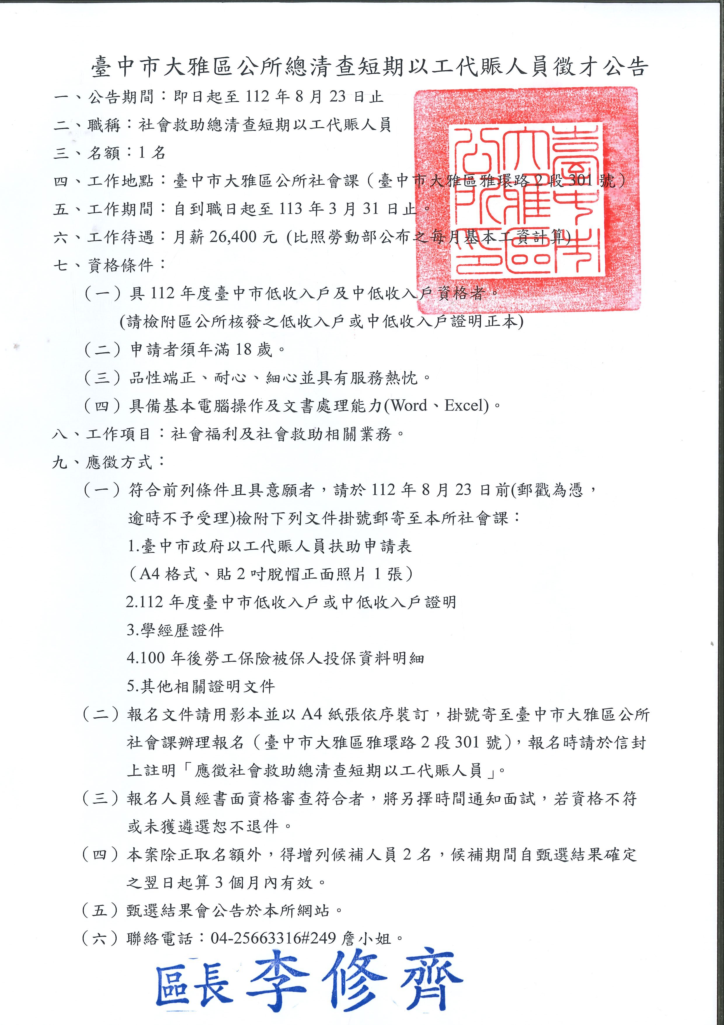 標題:【轉知】臺中市大雅區公所提供「113年度總清查短期以工代賑人員徵才公告