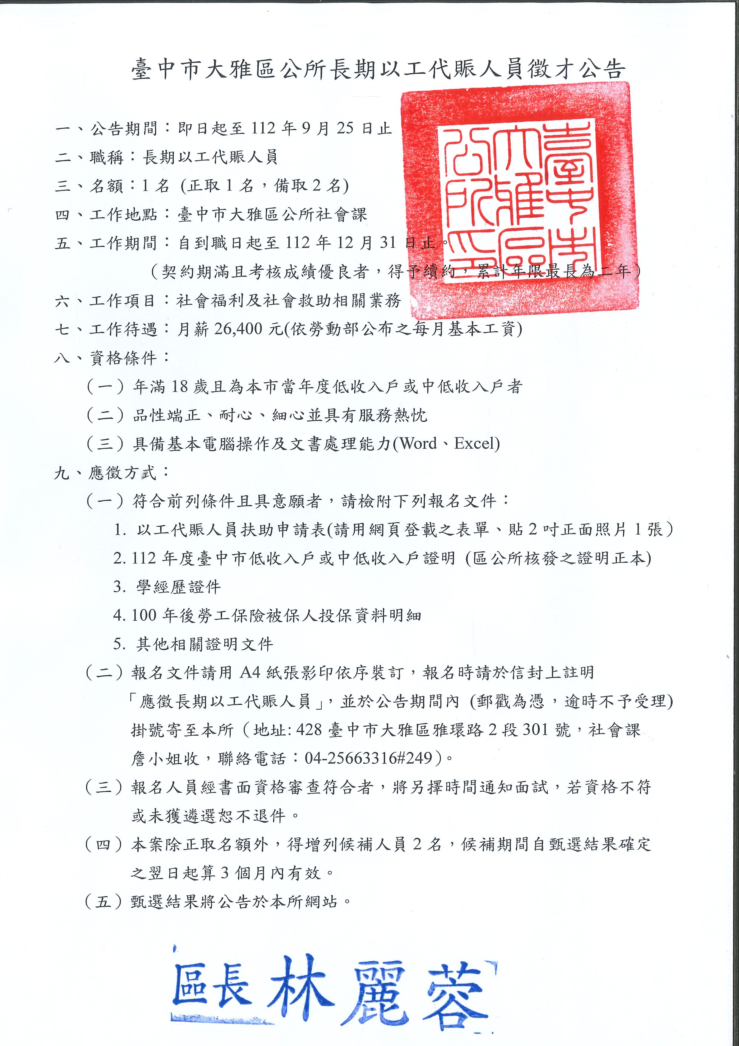 標題:【轉知】臺中市大雅區公所提供「112年度長期以工代賑人員徵才公告」