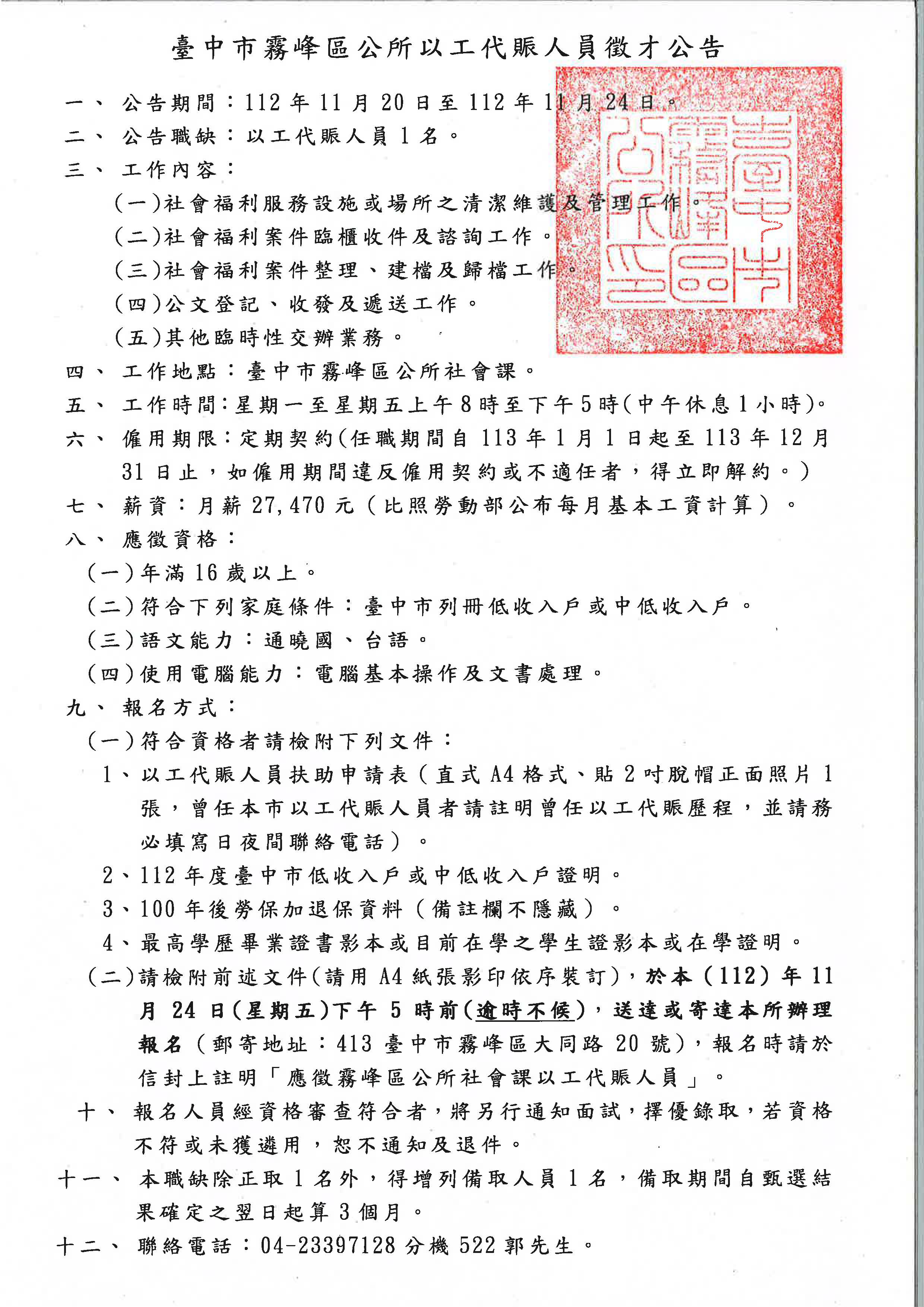 標題:【就業】臺中市霧峰區公所提供「113年度以工代賑人員徵才公告」