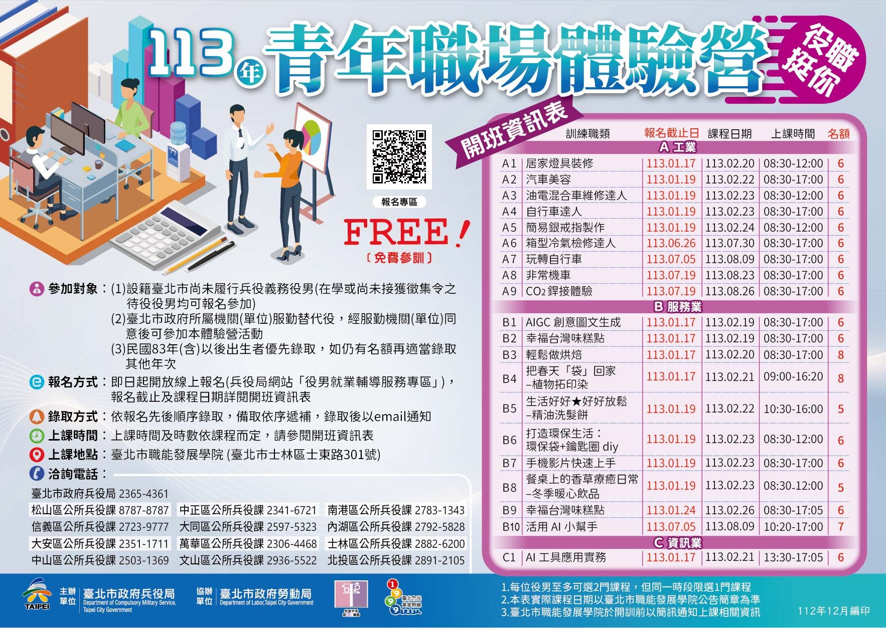 標題:【就業職能】台北市政府兵役局推行113年「青年職場體驗營」活動資訊