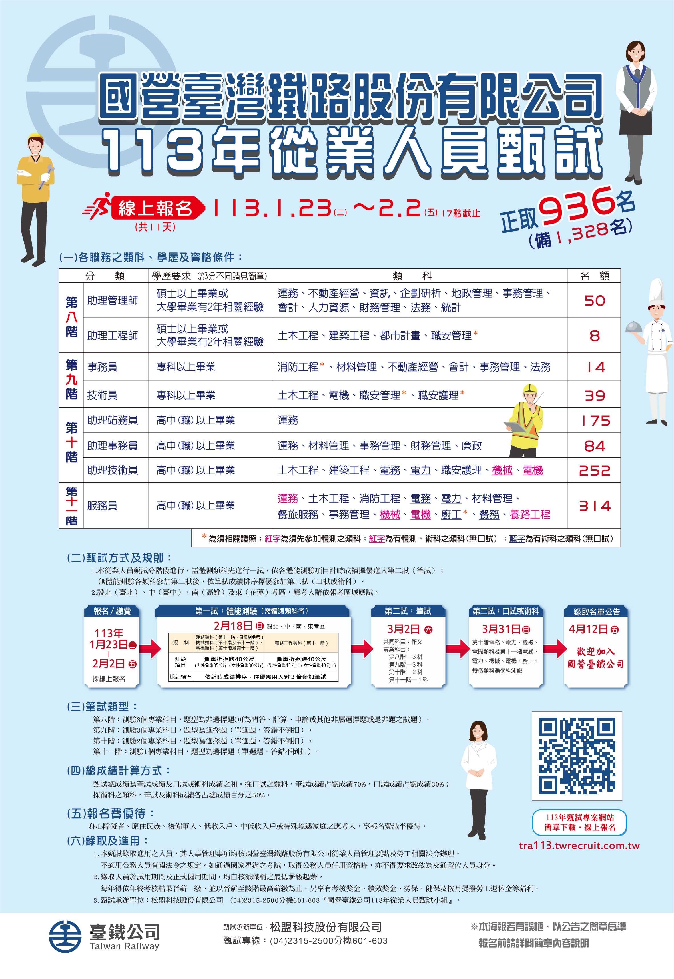 簡章取得方式:即日起於旨揭甄試網站(https://tra113.twrecruit.com.tw/news/?c=news&id=1)公告,電子檔免費下載,不另販售紙本簡章。 |