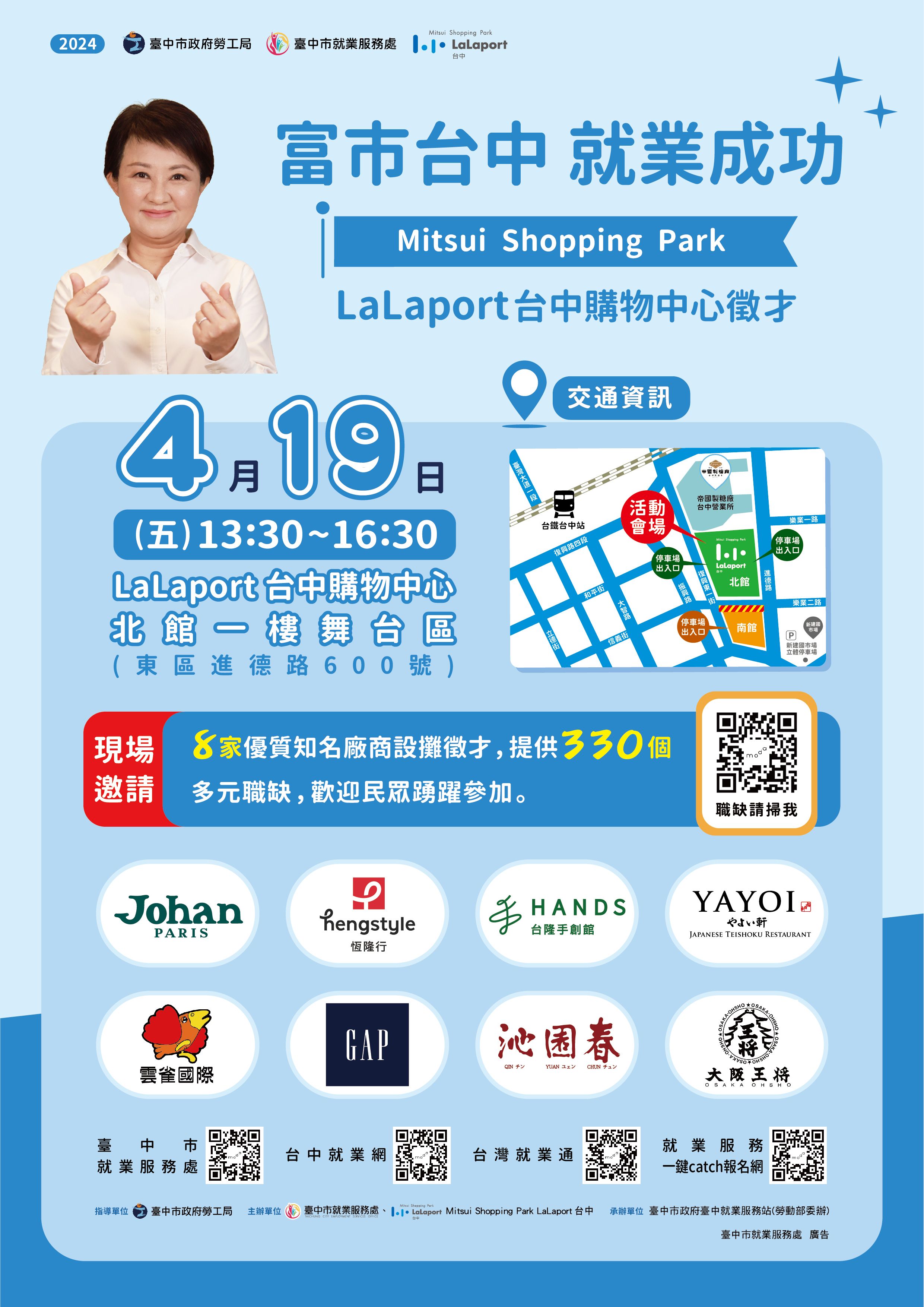 臺中市政府4月19日下午13:30至下午16:30,在LaLaport 台中購物中心北館一樓舉辦2024「富市台中 就業成功」徵才活動,邀請GAP、沁園春、YAYOI彌生軒、台隆手創館、雲雀餐飲集團等8家廠商,提供330個職缺,查詢職缺資訊:https://gov.tw/8yP,洽詢電話04-22225153。