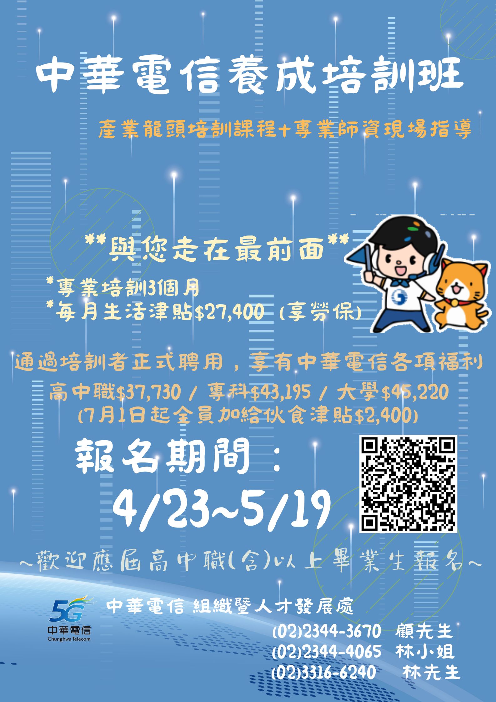 本公司為培育「電信線路建設與維運」工程師、「行動通信網路基地台建設及維運」工程師,預計招募305名優秀畢業生,並依職務所需專業技術提供養成培訓,培訓合格由本公司正式僱用。 |