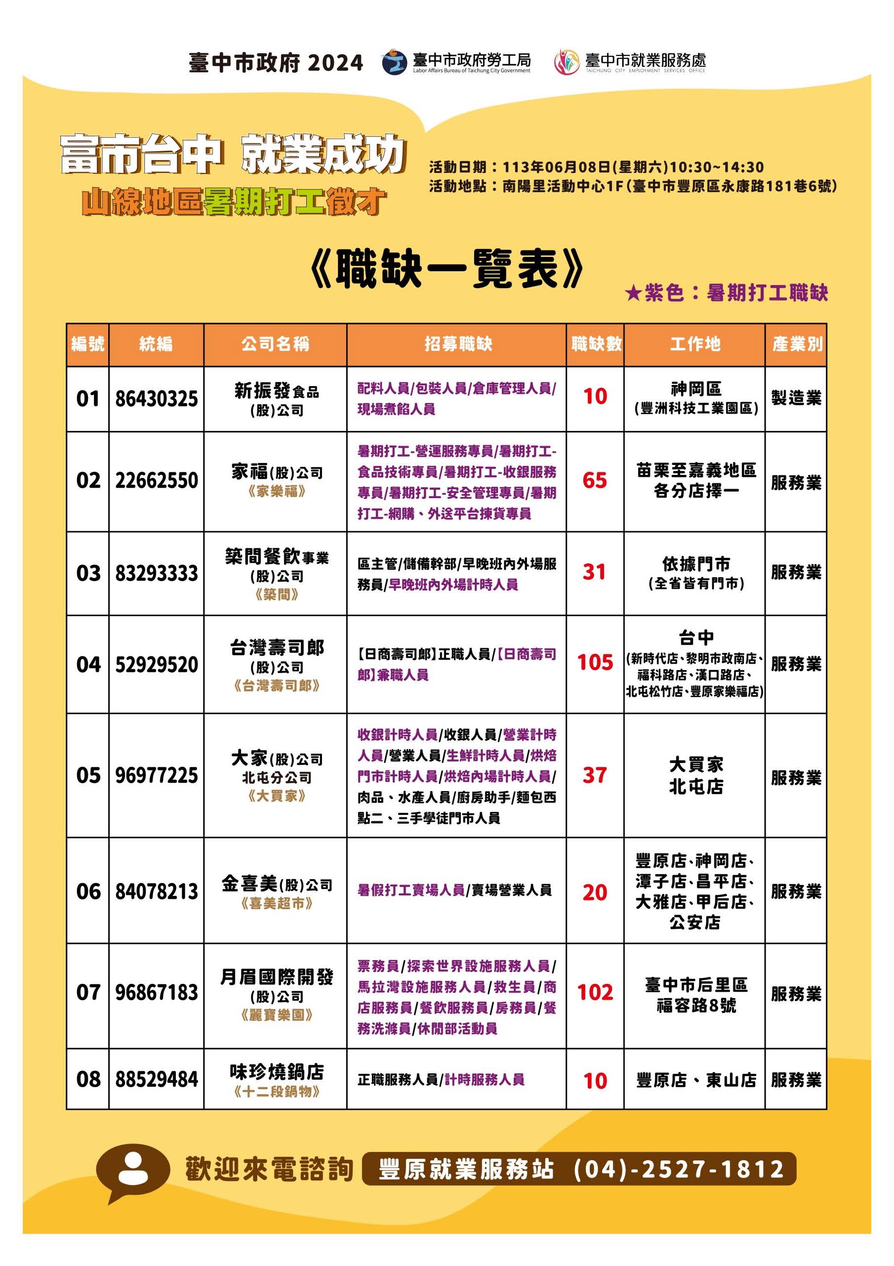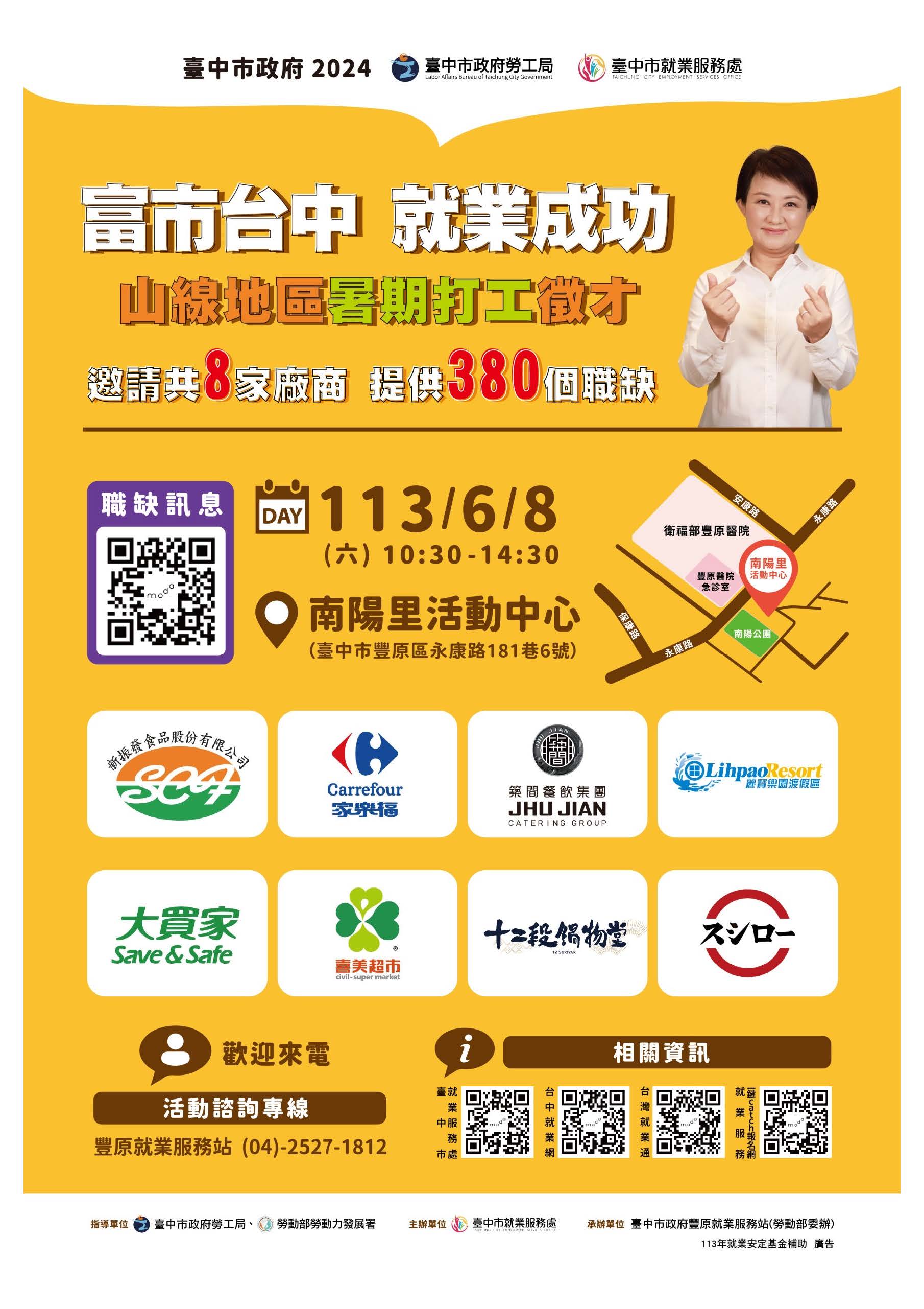 標題:【就業】113年6月8日(星期六)假豐原區南陽里活動中心舉辦「富市台中 就業成功」山線地區暑期打工徵才活動