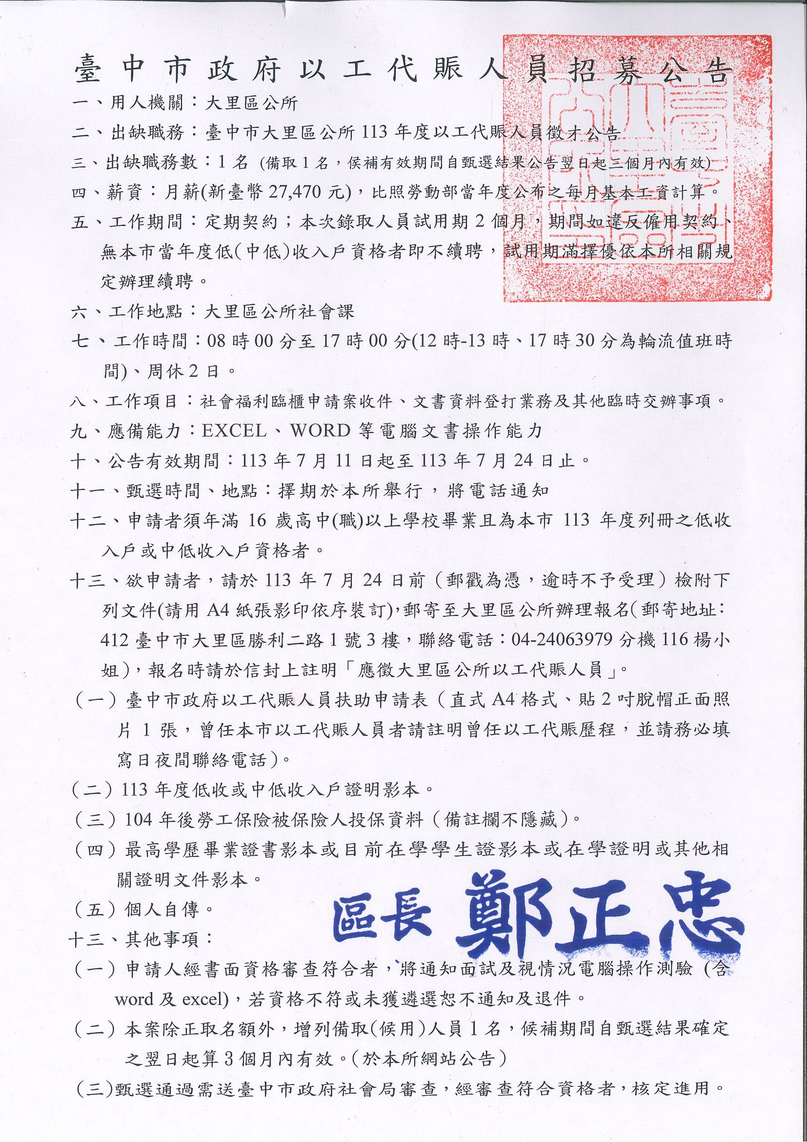 標題:【就業】臺中市大里區公所提供「113年度以工代賑人員徵才公告」0724止