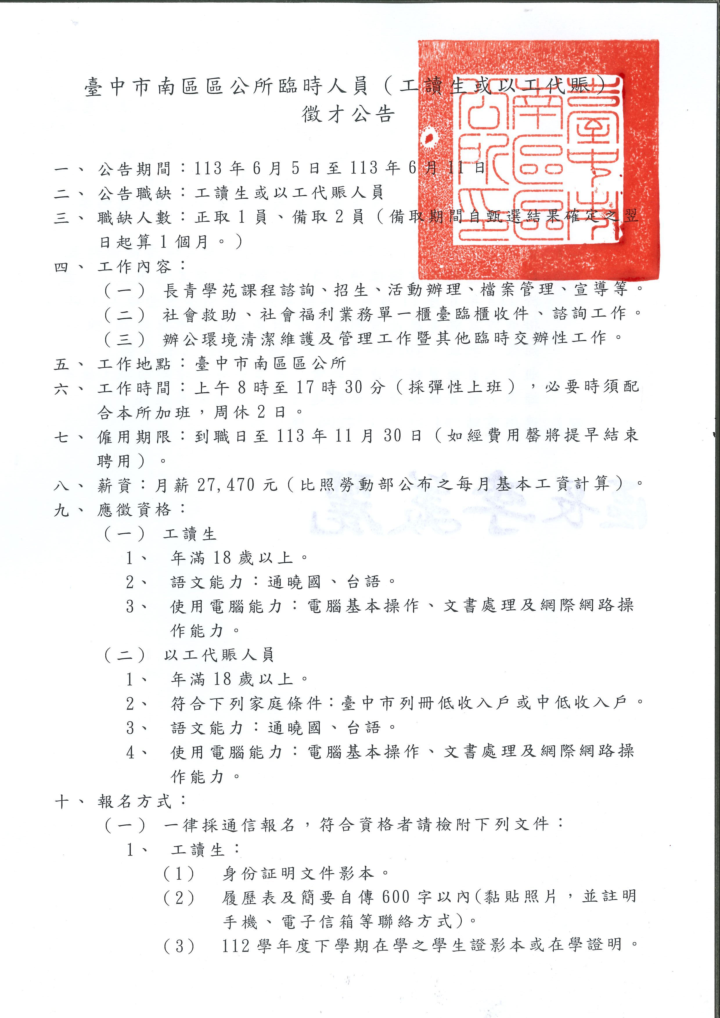標題:【就業】臺中市南區公所提供113年度臨時人員(工讀生或以工代賑)徵才公告