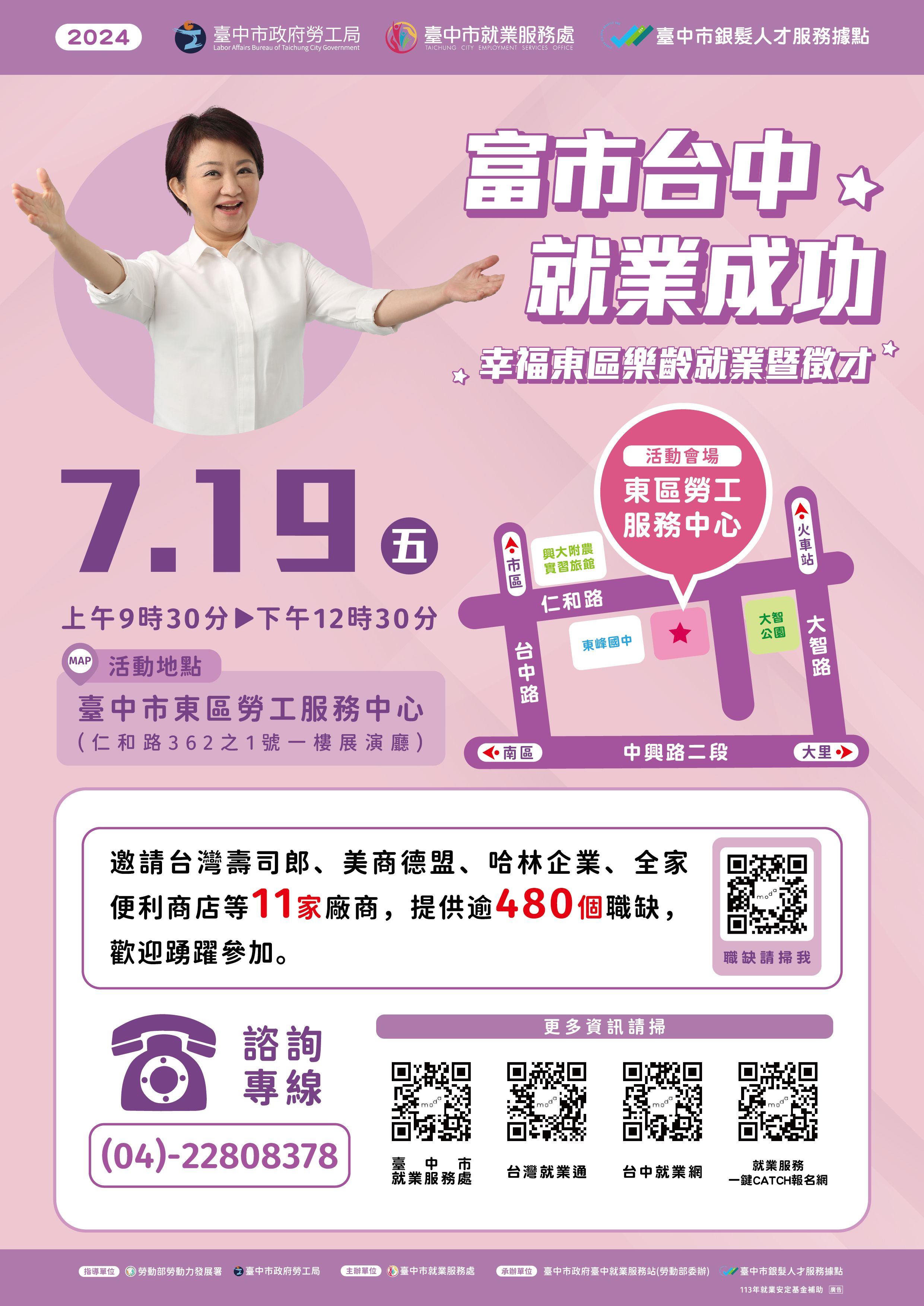 「臺中市政府7月19日上午9:30至12:30,在東區勞工服務中心舉辦2024「富市台中就業成功」幸福東區樂齡就業暨徵才,邀請台灣壽司郎、美商德盟、哈林企業、全家便利商店等11家廠商,提供逾480個工作機會,查詢職缺資訊:https://gov.tw/8HX,詳情請洽04-22808378臺中市銀髮人才服務據點洽詢。」