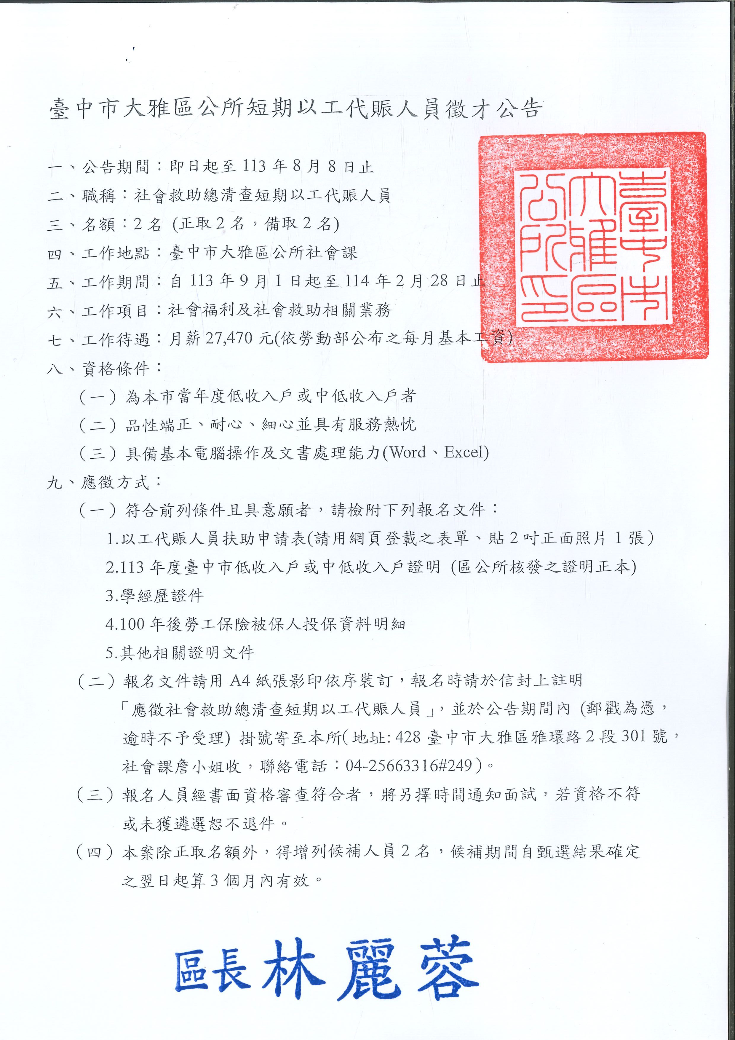 標題:【就業】臺中市大雅區公所提供「113年度以工代賑人員徵才公告」