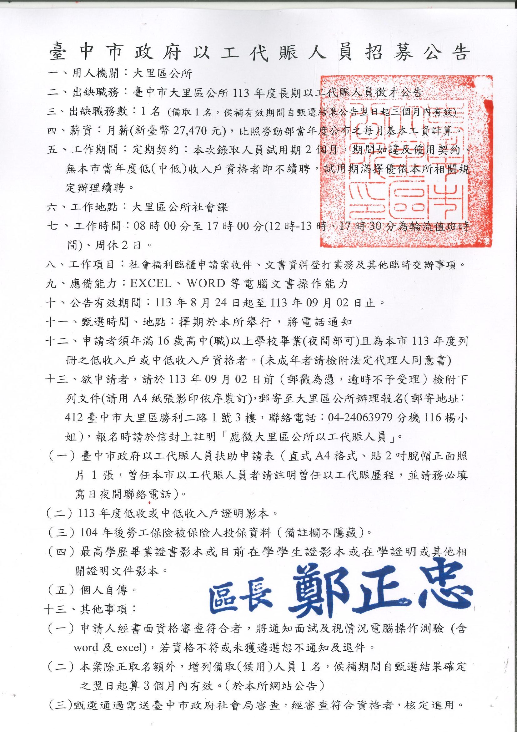 標題:【就業】臺中市大里區公所114年度總清查短期以工代賑人員徵才公告