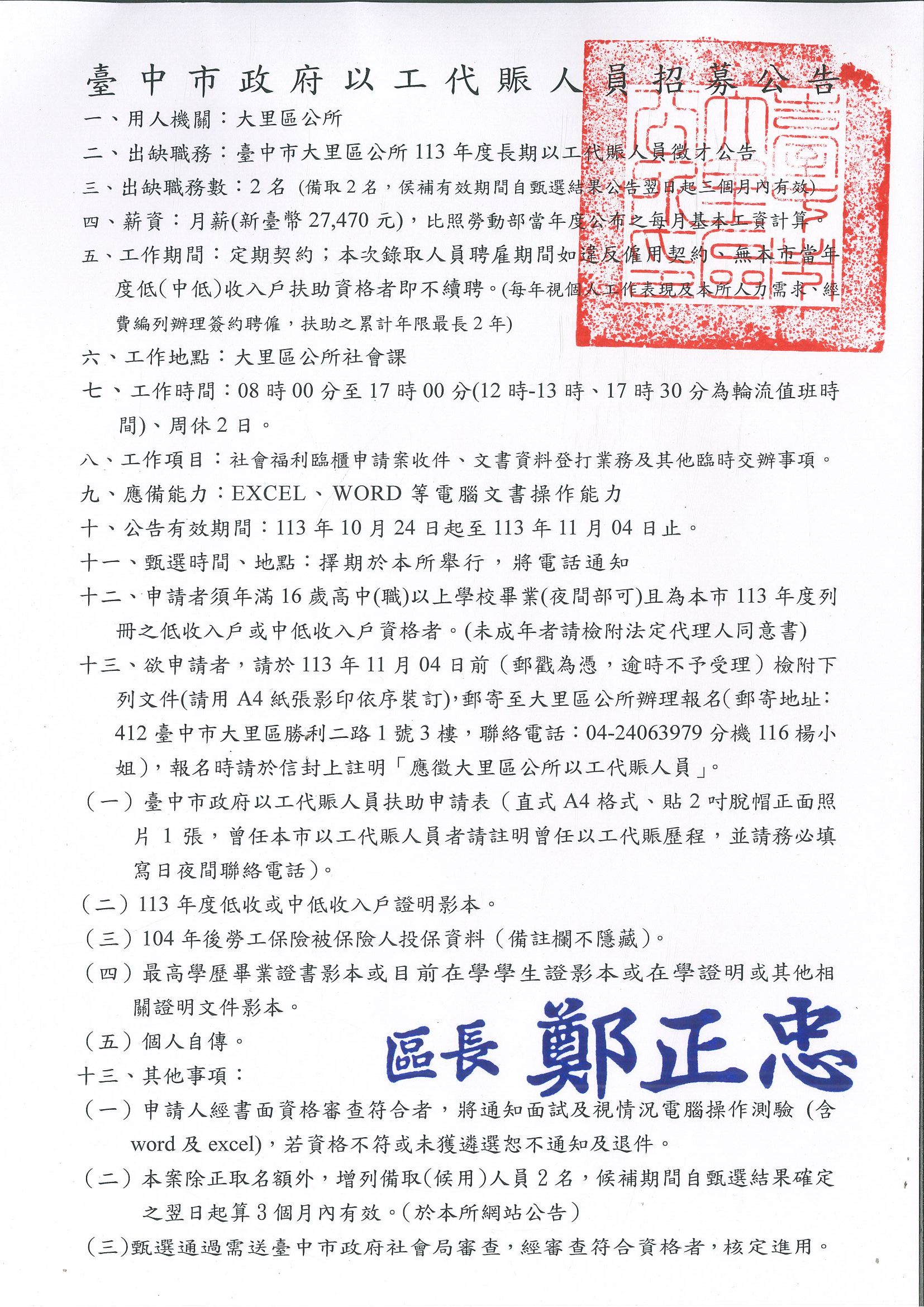 標題:【就業】臺中市大里區公所提供「113年度長期以工代賑人員徵才公告」