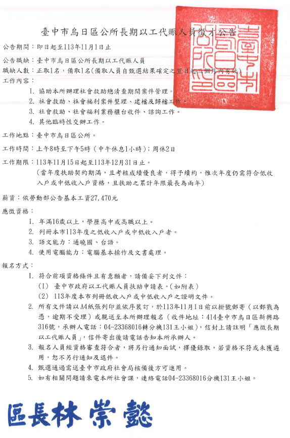 標題:【就業】臺中市大里區公所提供「113年度長期以工代賑人員徵才公告」