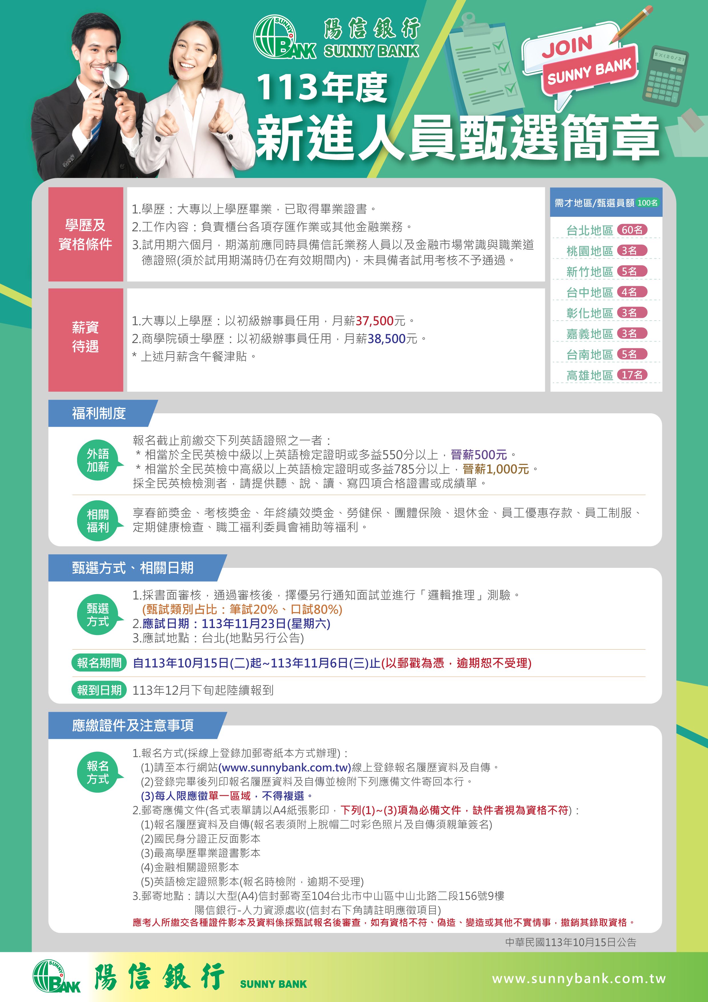 陽信銀行113年為對外招募新進櫃台人員100名,辦理本次公開甄選活動,