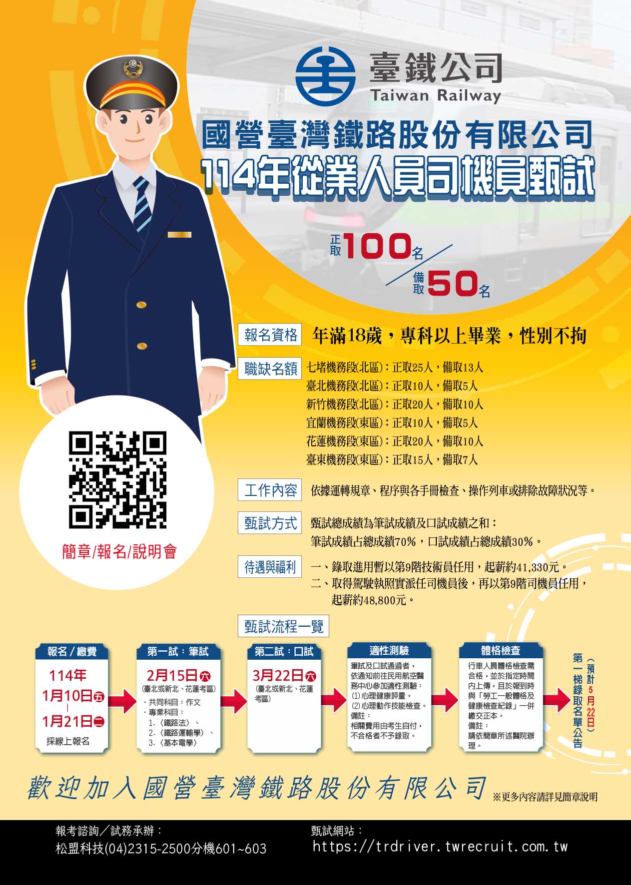 簡章取得方式:即日起於(https://trdriver.twrecruit.com.tw/news/?c=news&id=2)「國營臺灣鐵路股份有限公司114 年從業人員司機員甄試簡章暨招考」最新消息/訊息公告,電子檔免費下載,不另販售紙本簡章。 |
