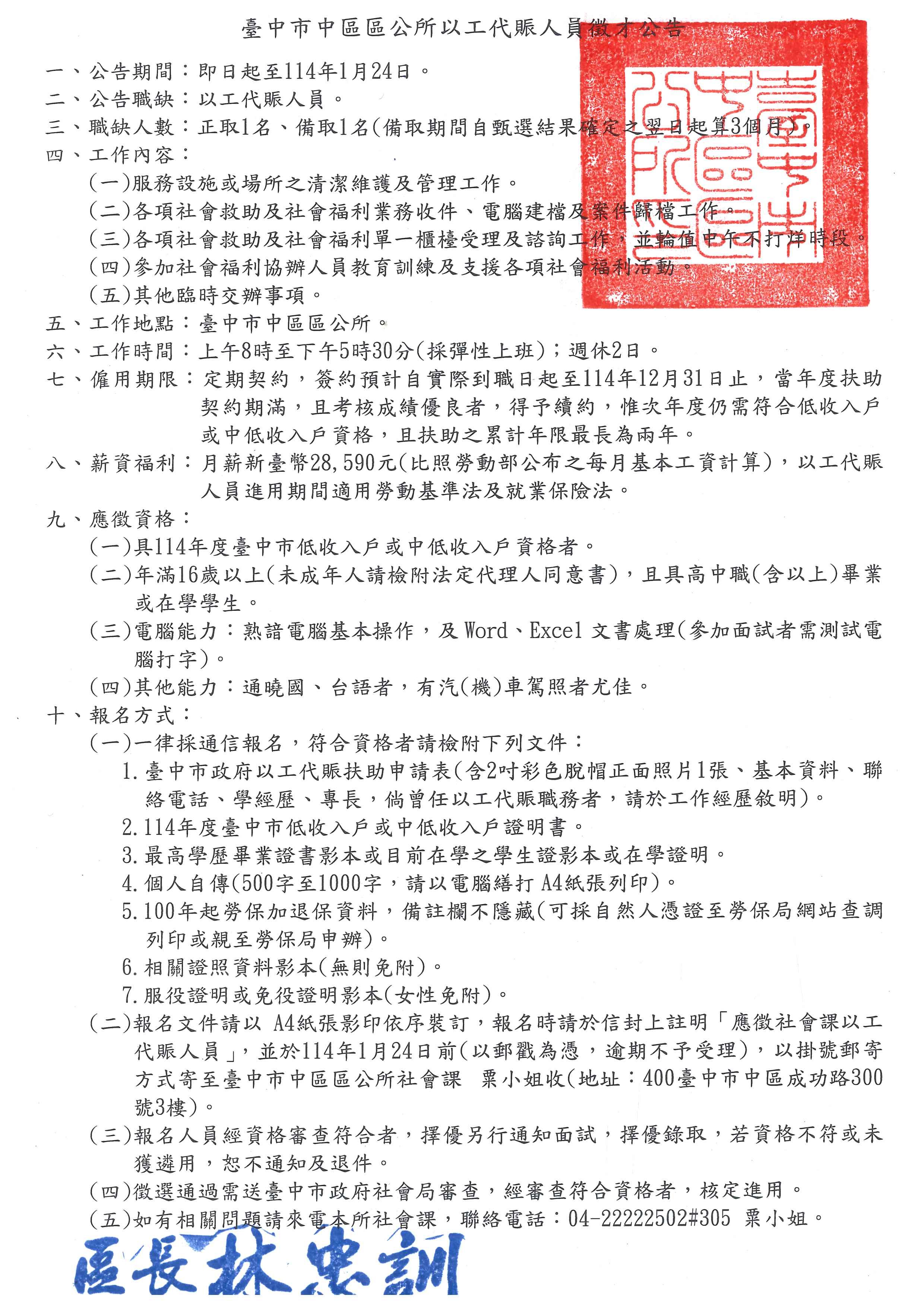 標題:【就業】臺中市中區區公所提供「以工代賑人員徵才公告」