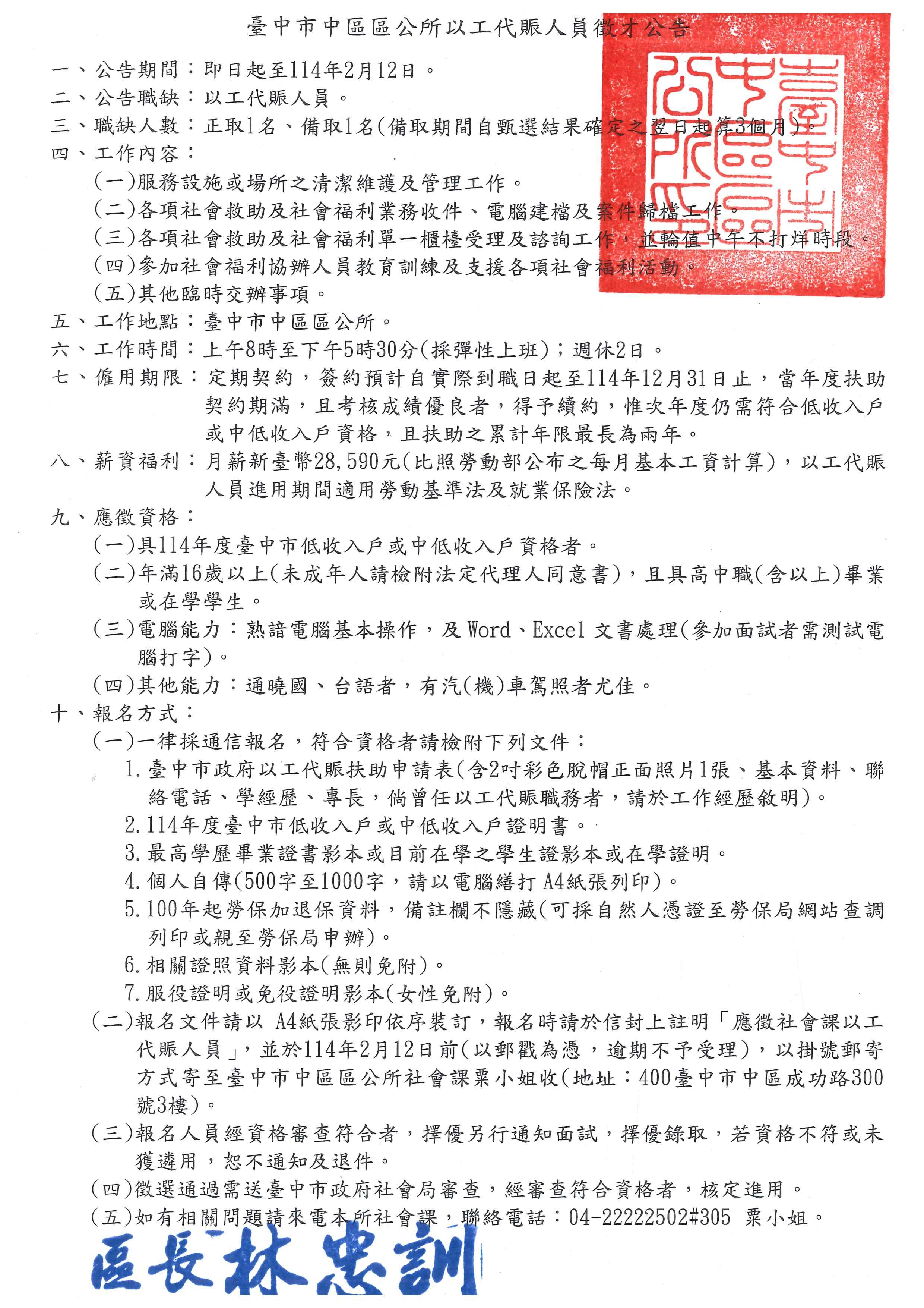標題:【就業】臺中市中區區公所提供「以工代賑人員徵才公告」
