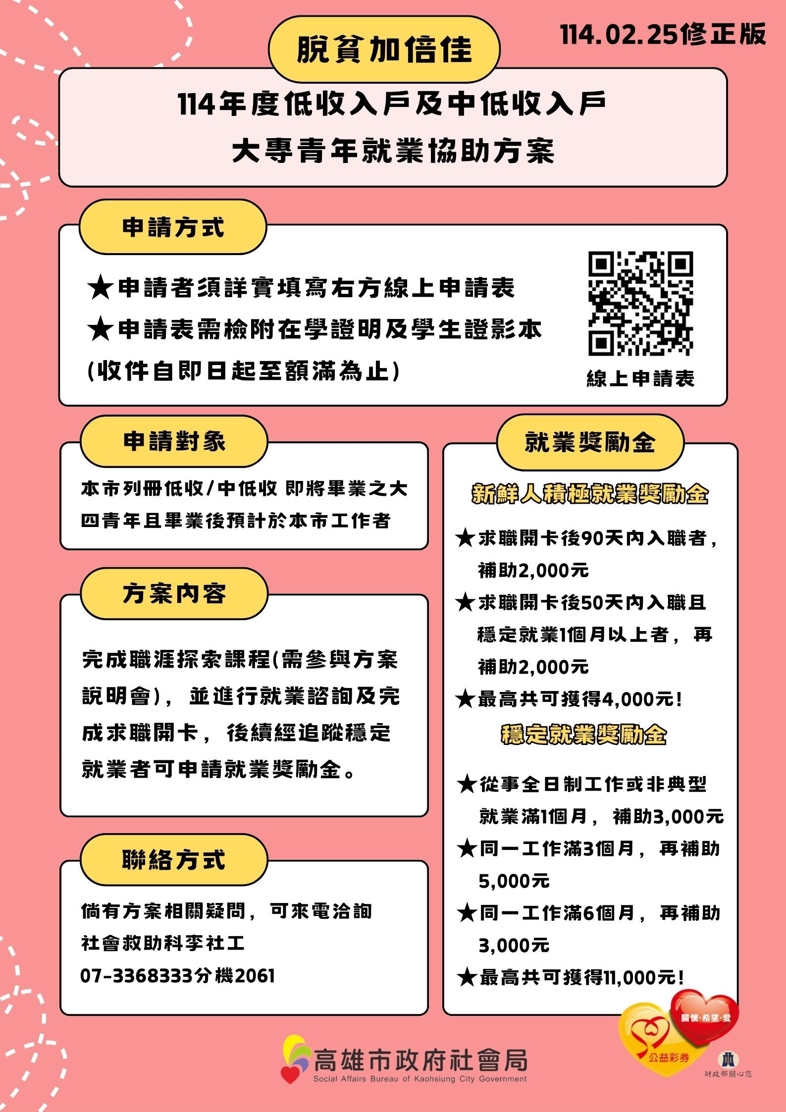 標題:【就業】高雄市政府社會局「脫貧加倍佳—114年度低收入戶及中低收入戶大專青年就業協助方案」