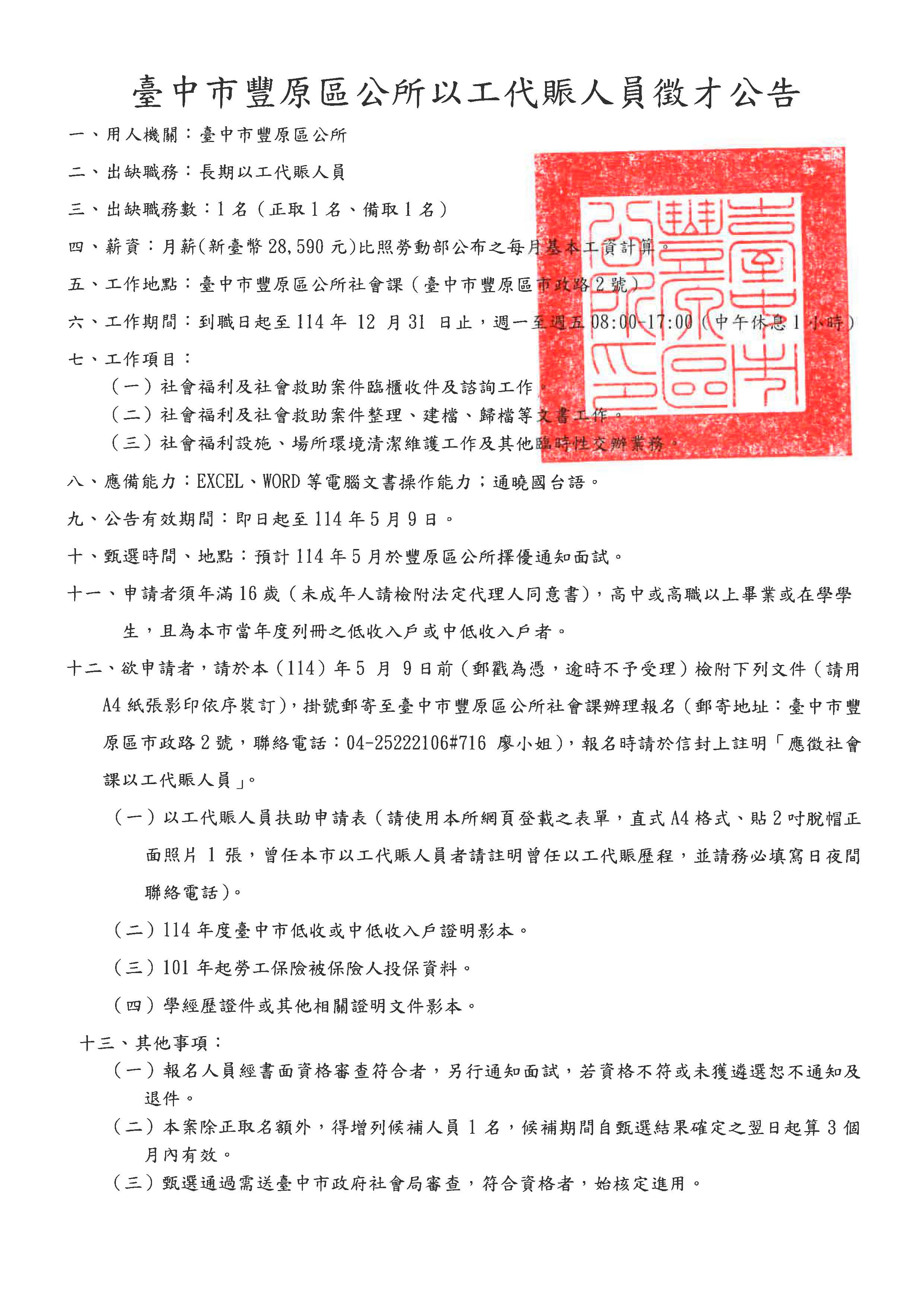 標題:【就業】臺中市豐原區公所114年以工代賑人員徵才
