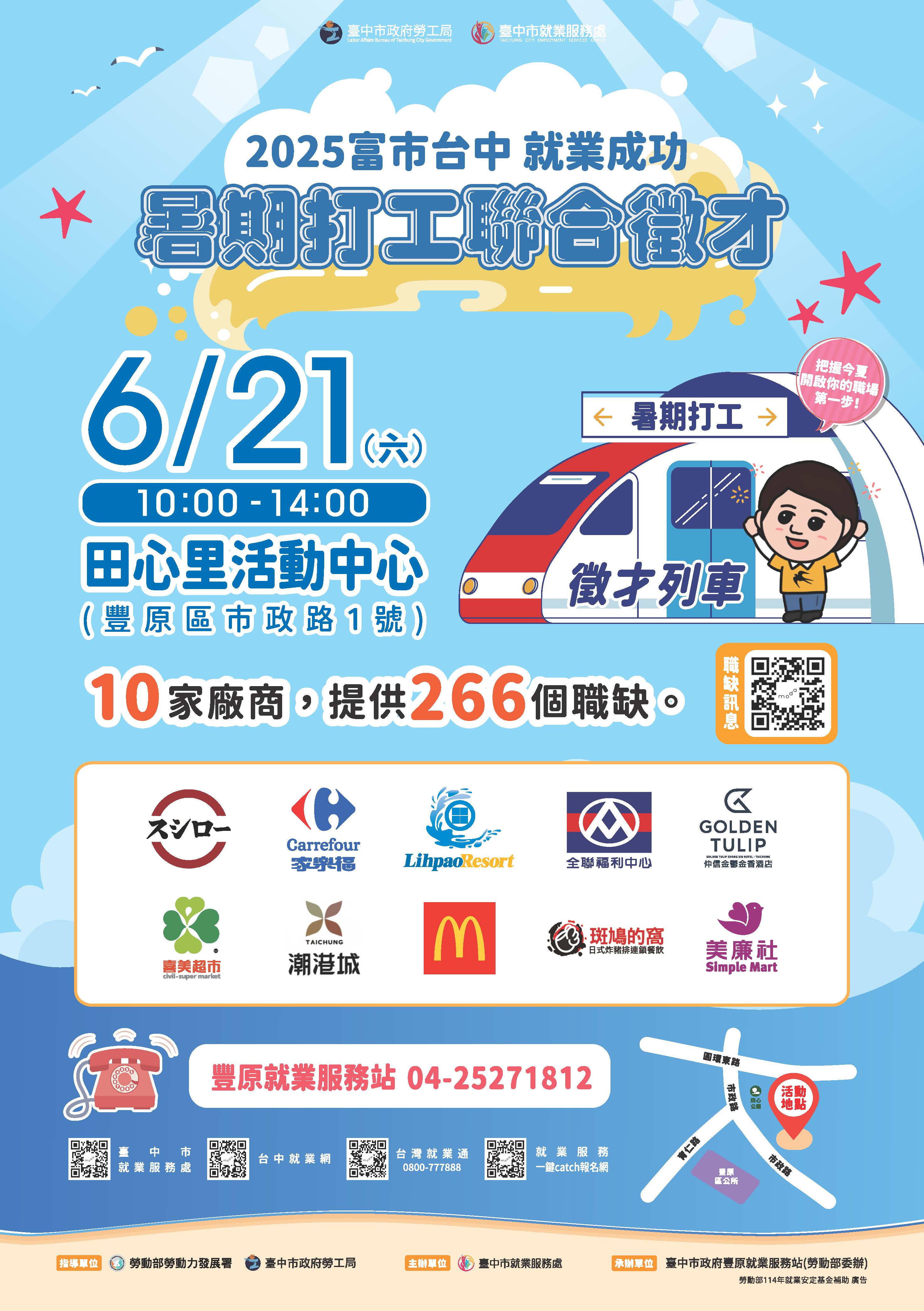 邀請麥當勞、家樂福及喜美超市等10家廠商,提供266個就業機會,歡迎把握機會踴躍參加,活動詳情請至臺中市就業服務處官網查詢 。」
