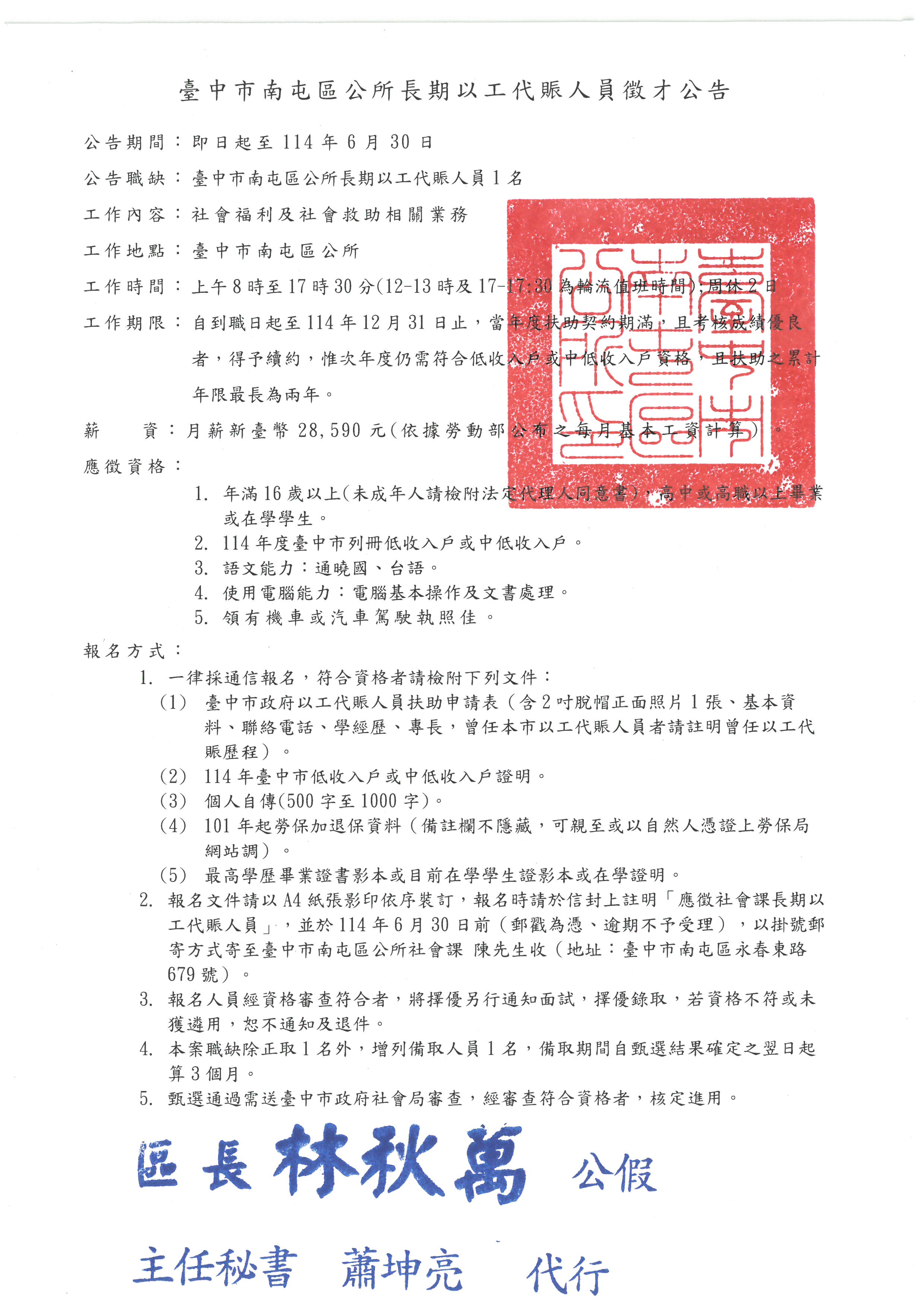 標題:【就業】臺中市南屯區公所以工代賑人員徵才公告