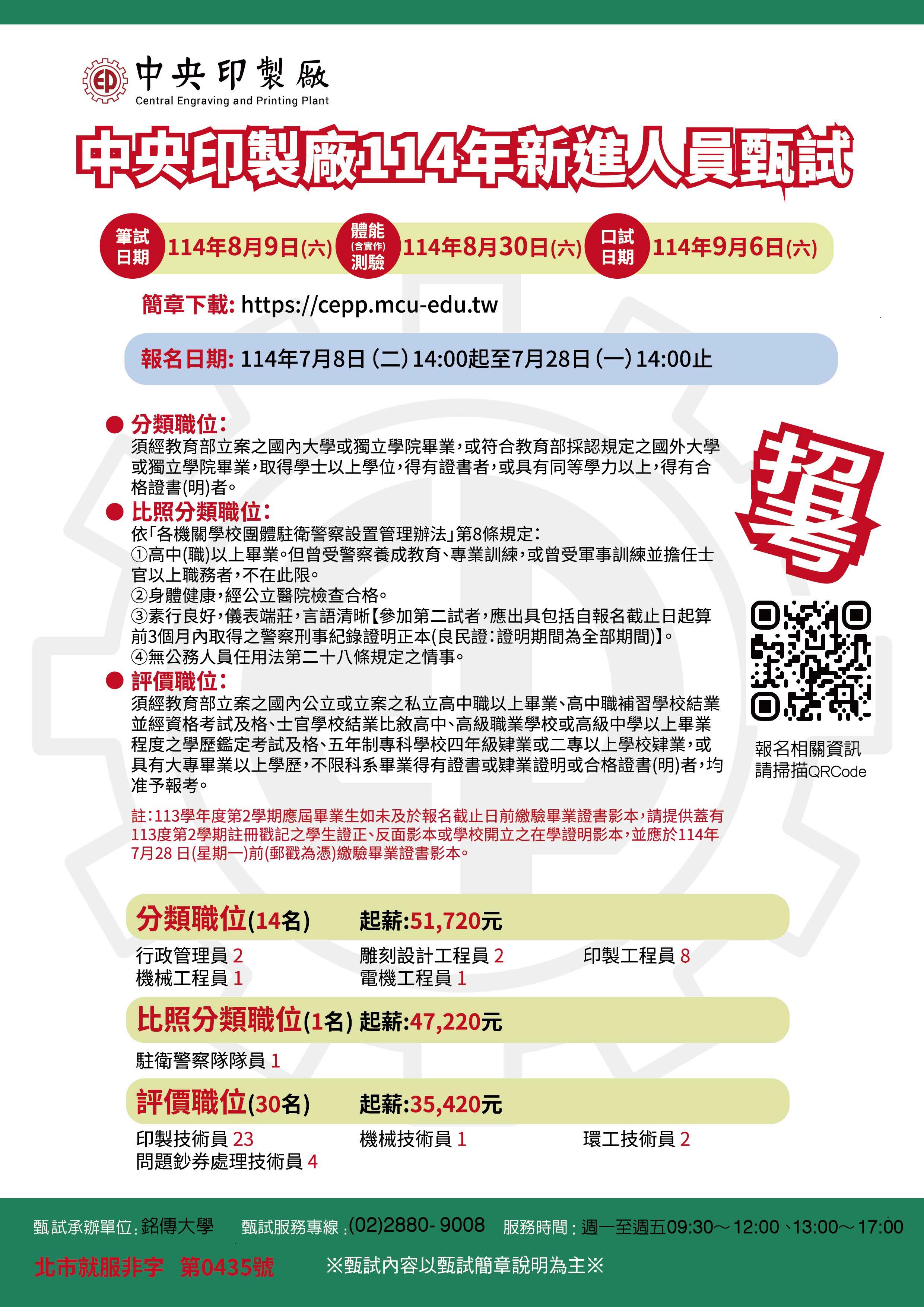 | 標題:【就業】中央銀行所屬中央印製廠114年新進人員甄試簡章 |