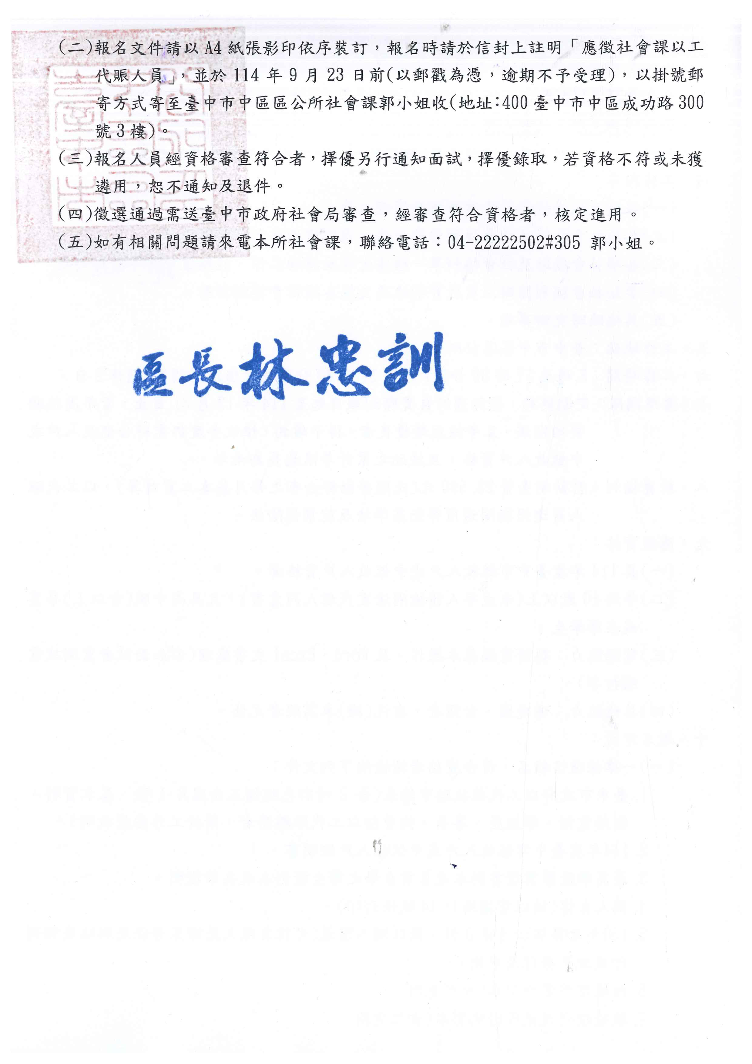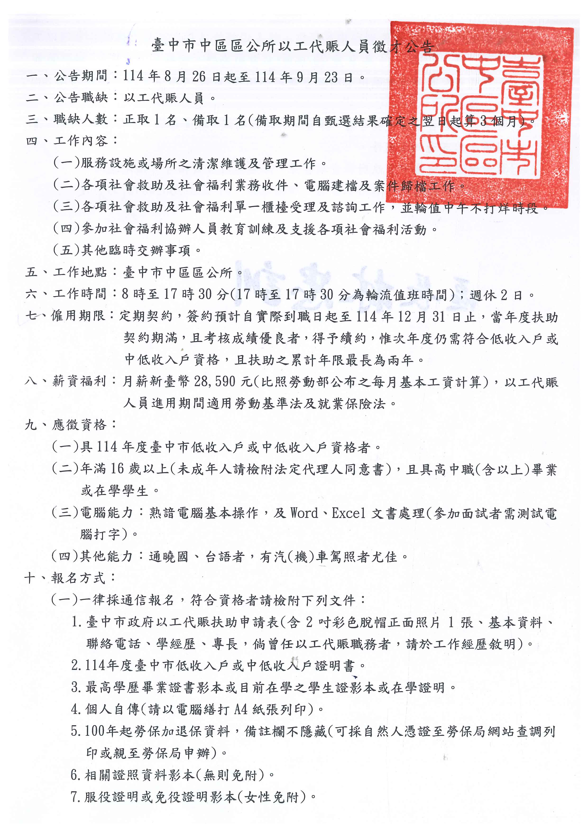 標題:【就業】臺中市中區區公所以工代賑人員徵才公告