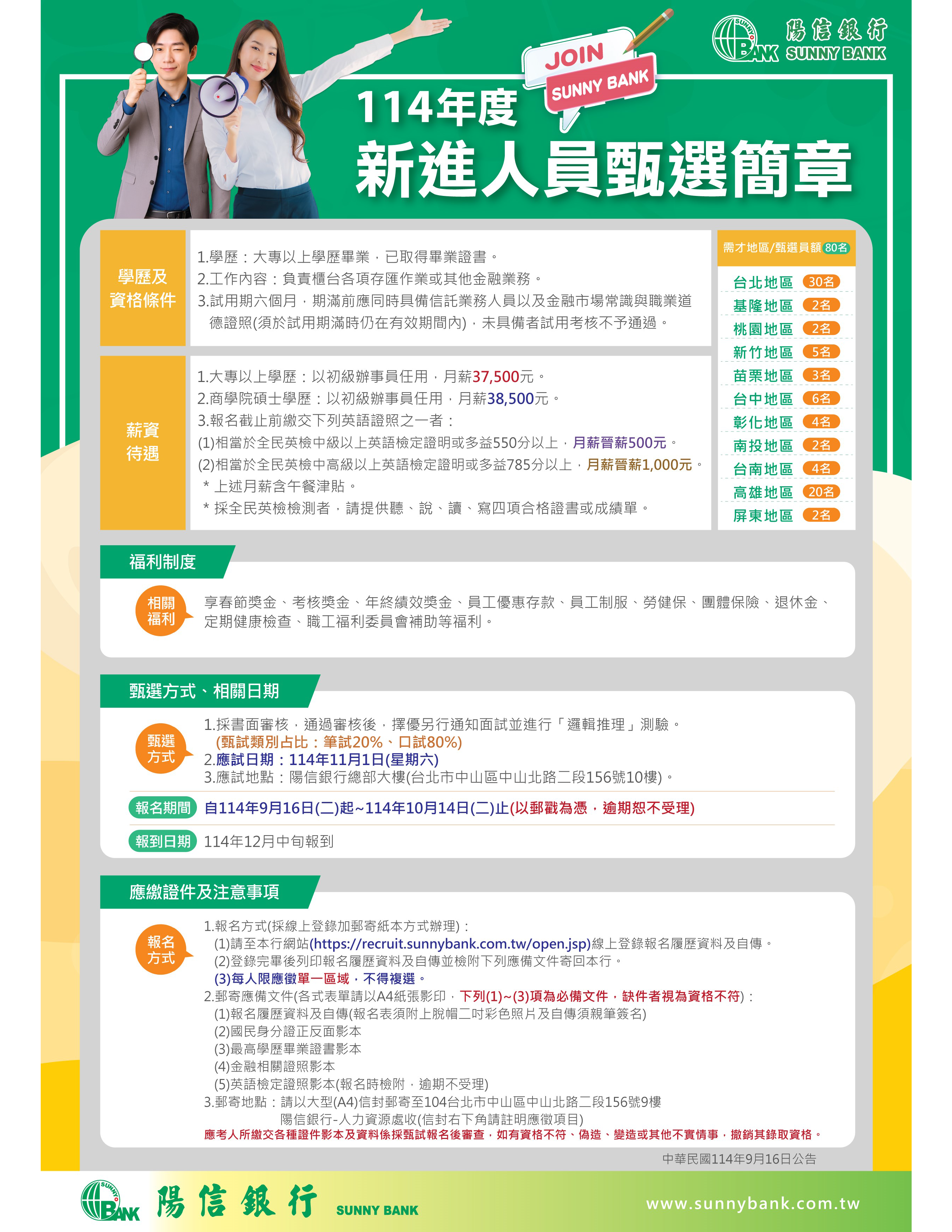 📲甄試相關連結請洽陽信商業銀行人才招募網站:https://recruit.sunnybank.com.tw/open.jsp。