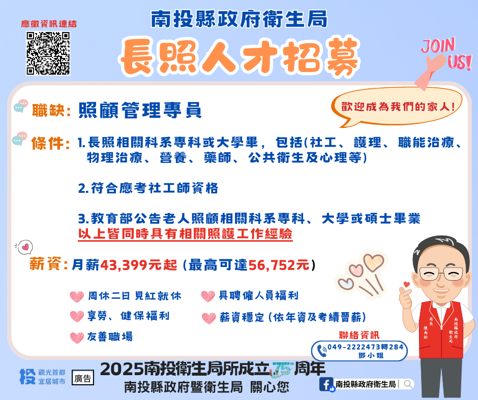 因應長期照護服務需求,提升照護品質,本局招募照顧管理專員,特此向貴校徵才。 |