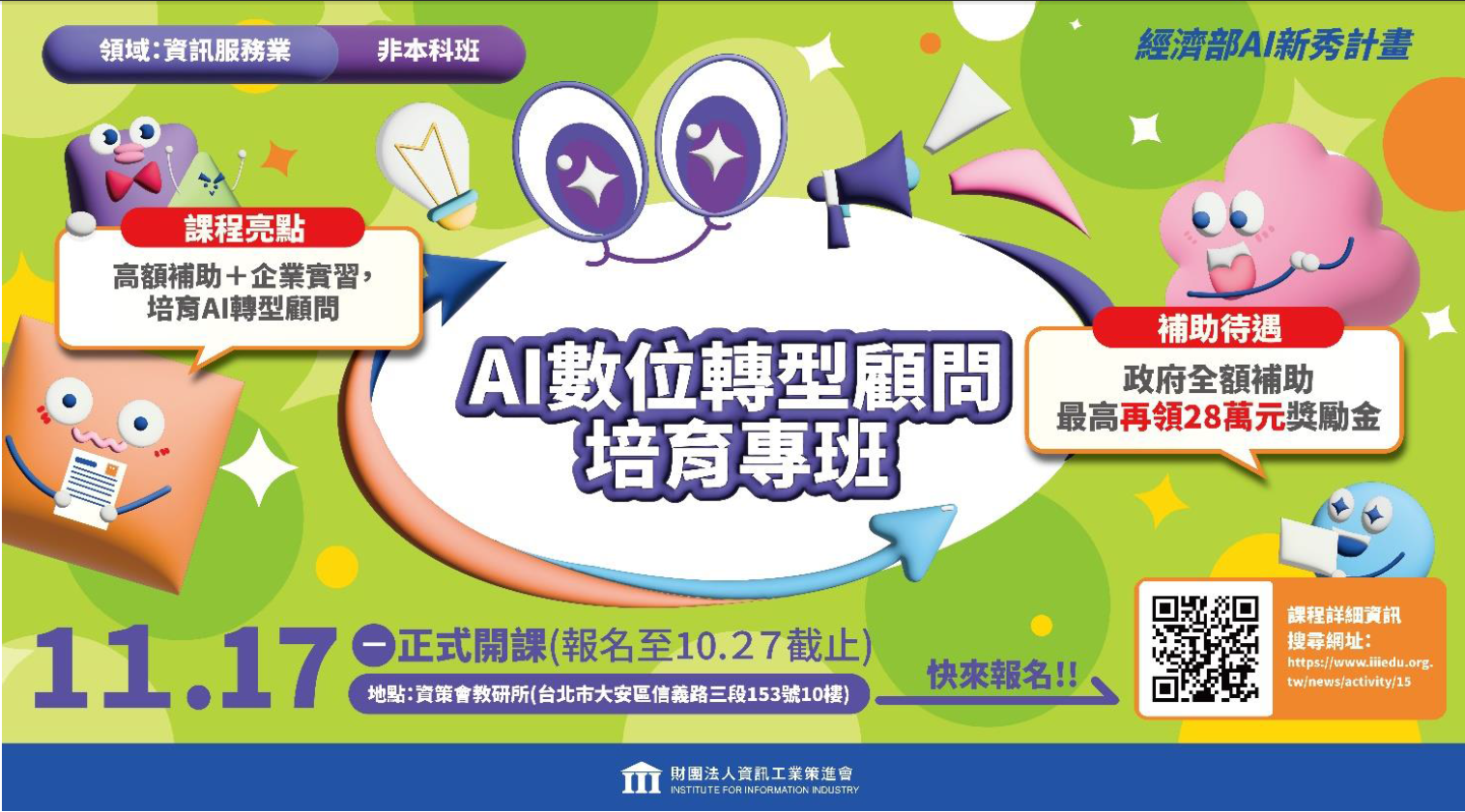 檢附「AI數位轉型顧問培育專班」招生簡章,報名網址為:
