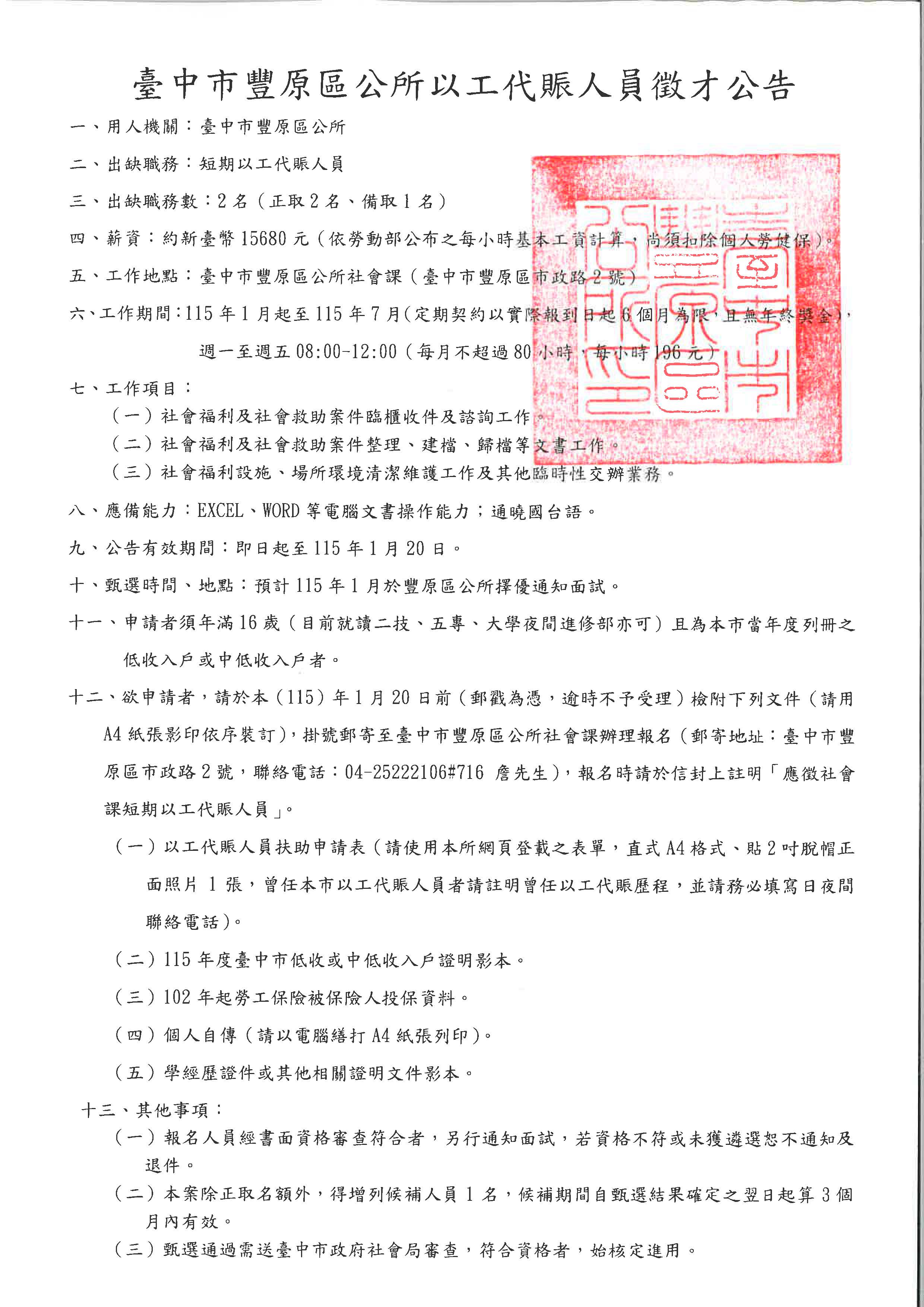 標題:【就業】豐原區115年短期以工代賑人員徵才公告