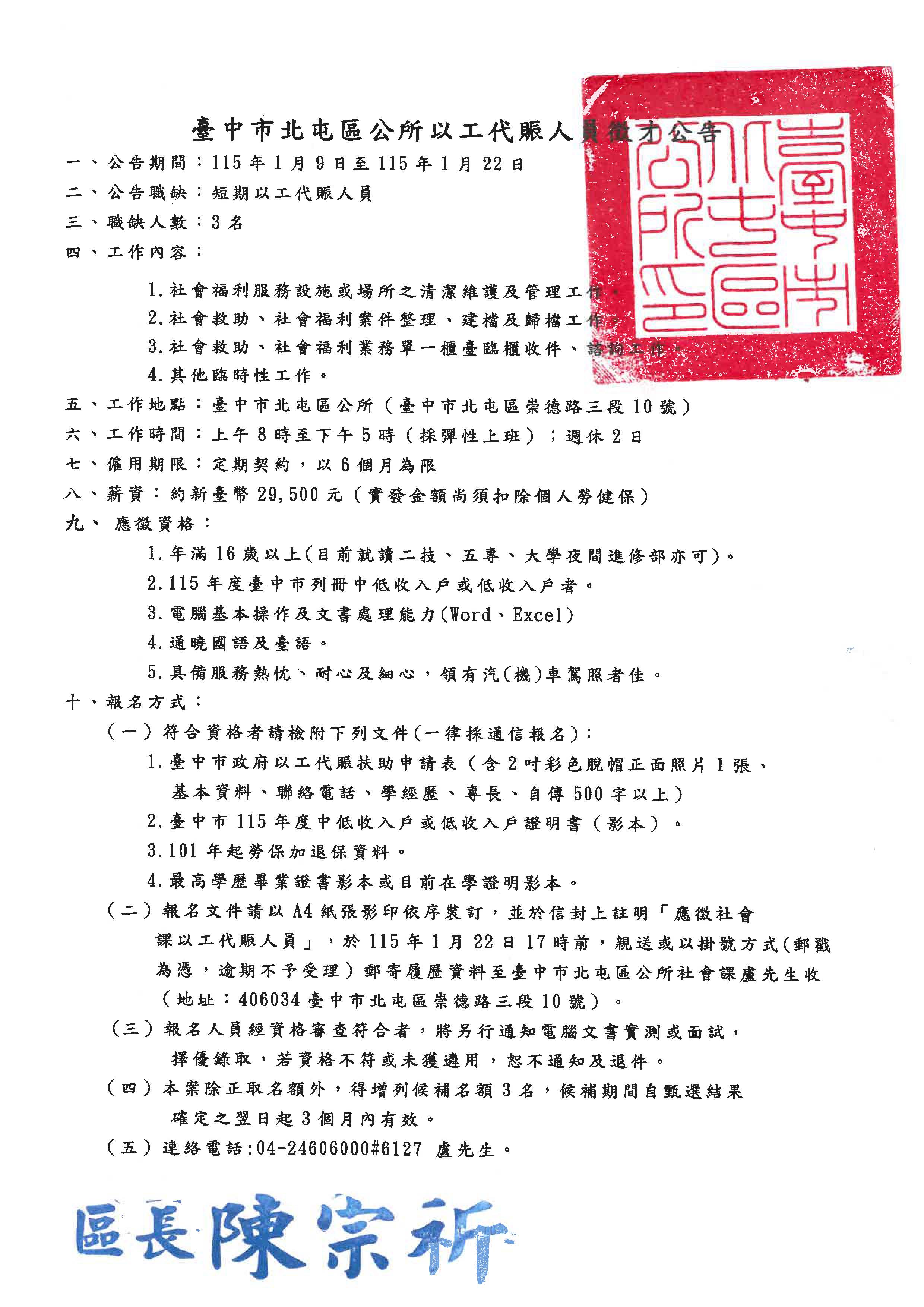 標題:【就業】臺中市北屯區公所115年工代賑人員徵才公告