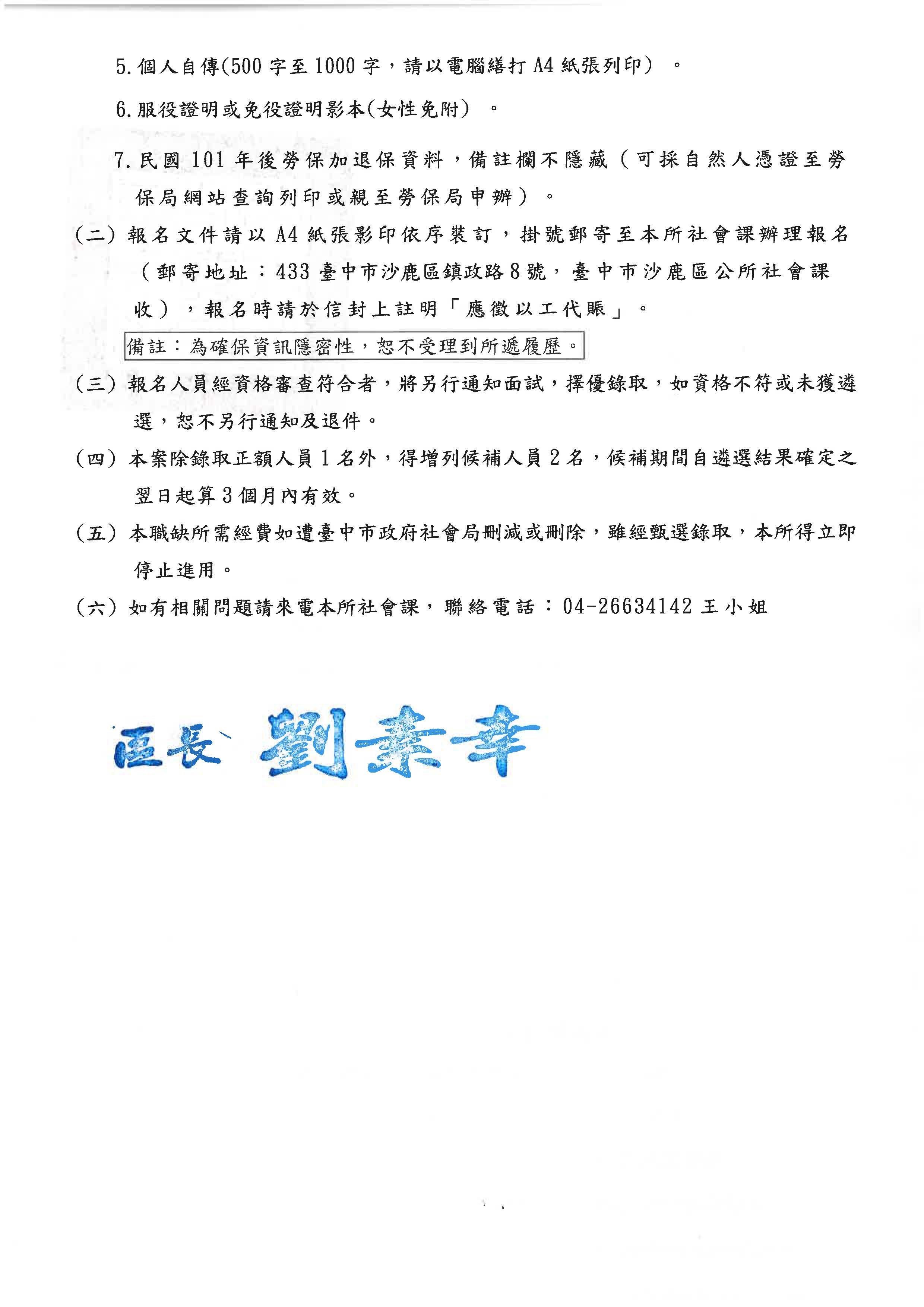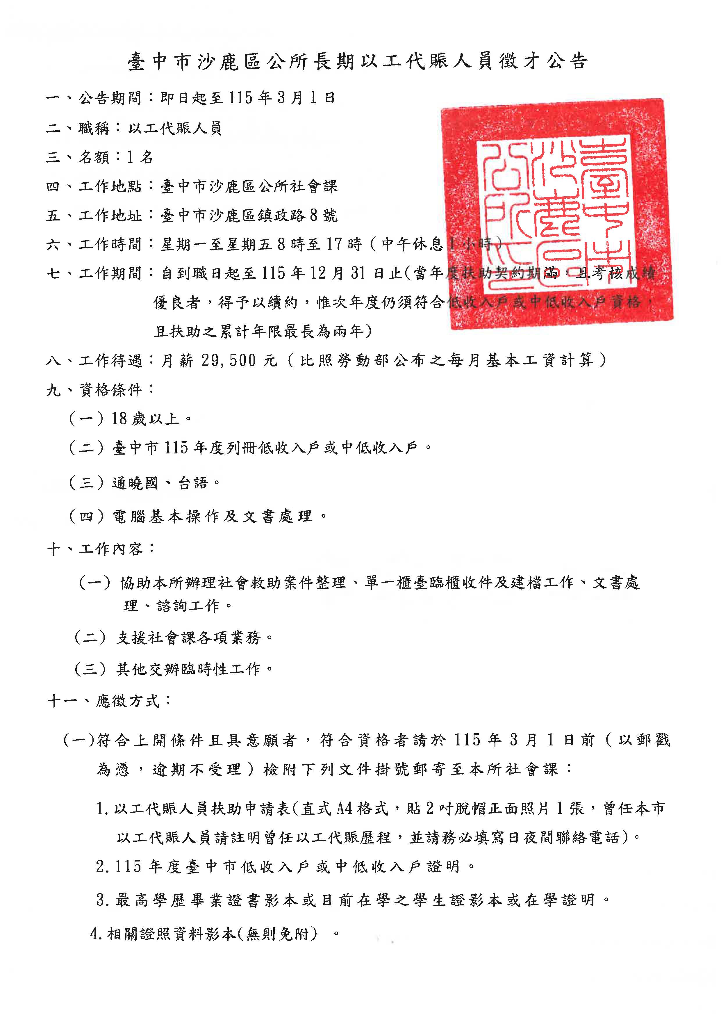 標題:【就業】臺中市沙鹿區公所社會課以工代賑人員徵才公告
