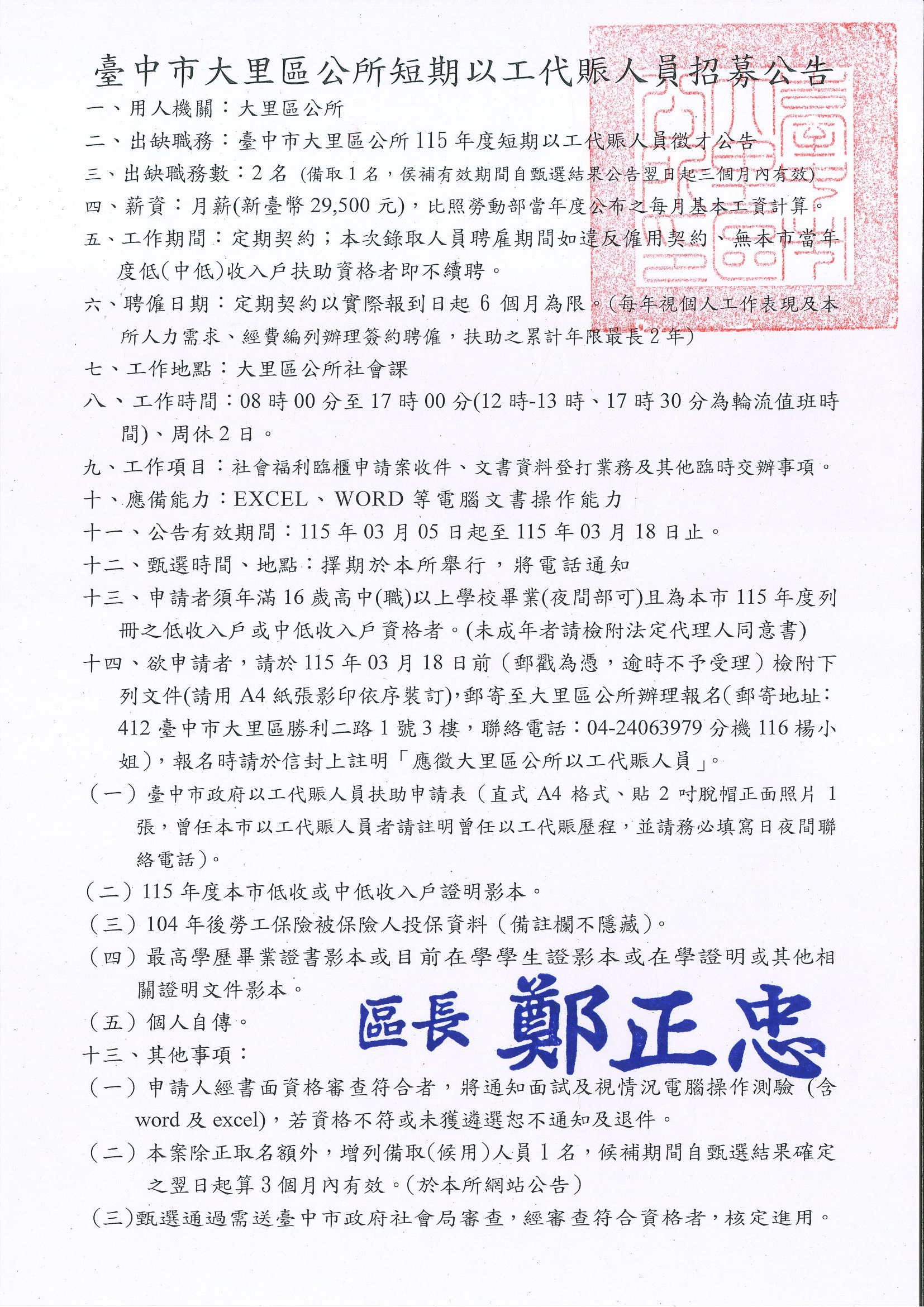 標題:【就業】臺中市大里區公所115年度低收入戶及中低收入戶短期以工代賑人員徵才公告