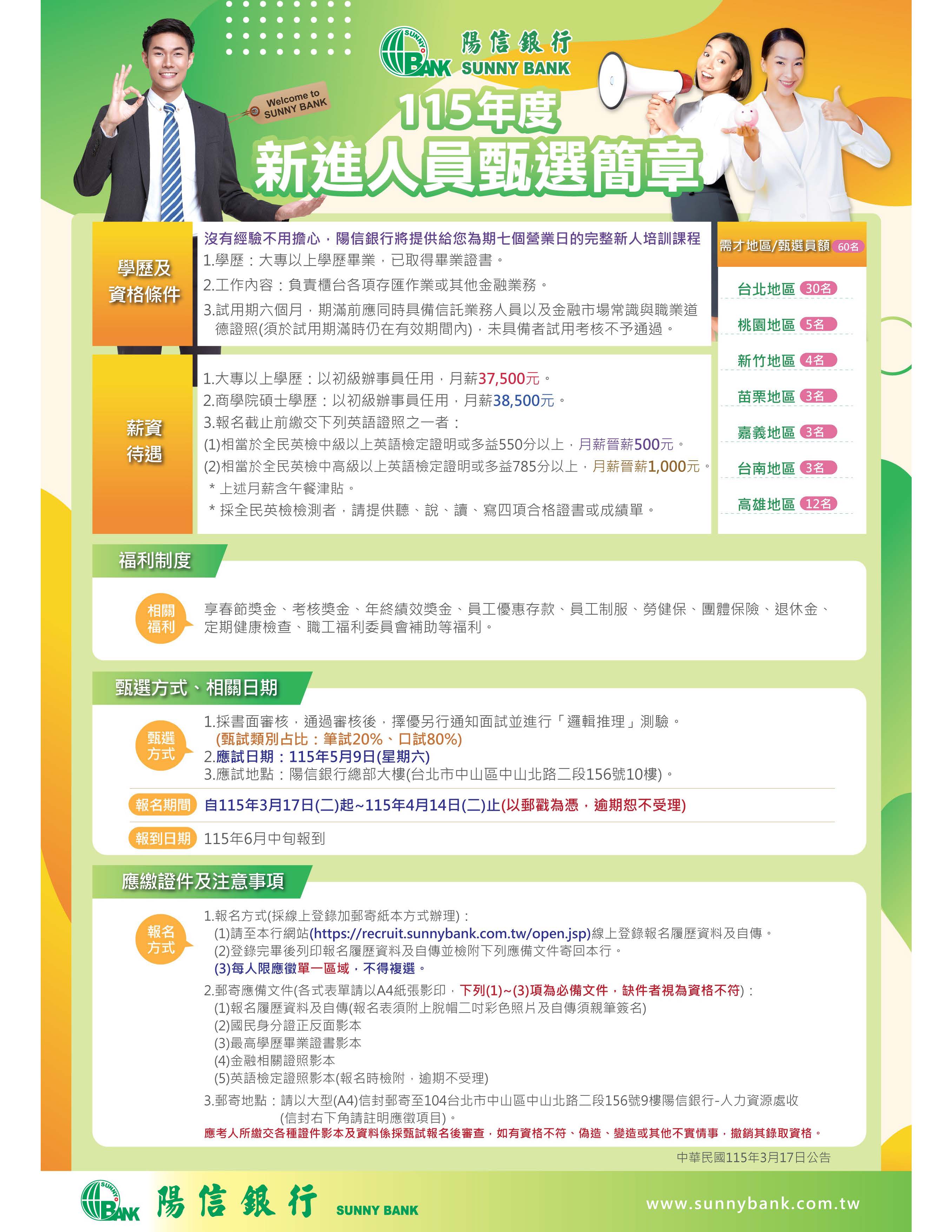 甄試相關連結請洽陽信商業銀行人才招募網站:https://recruit.sunnybank.com.tw/open.jsp